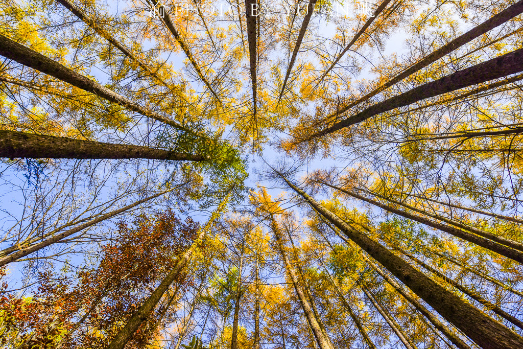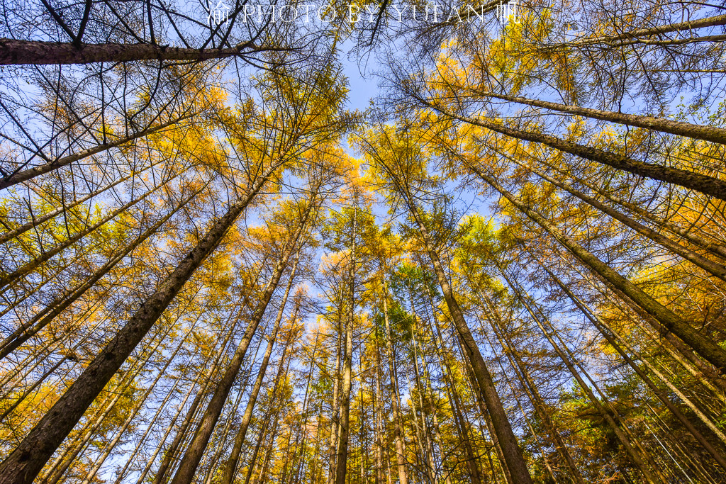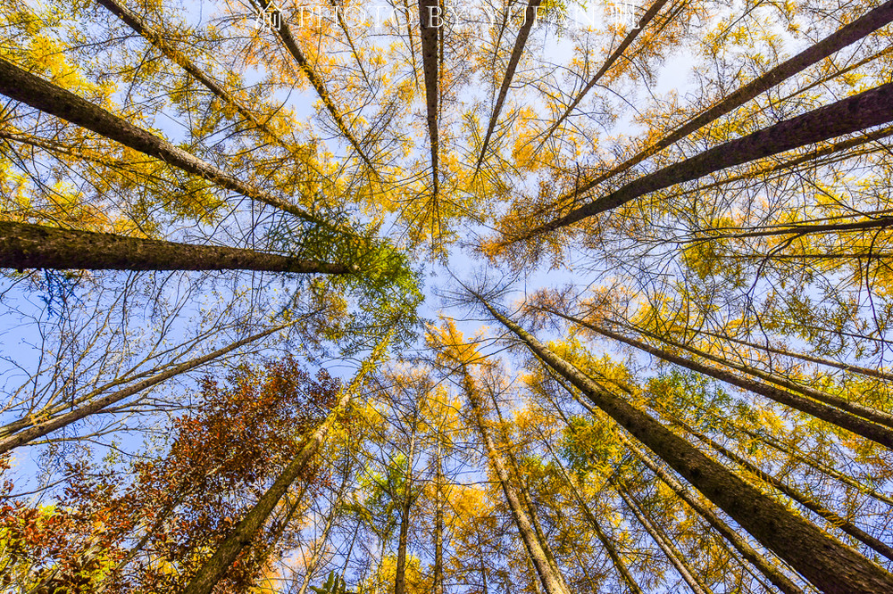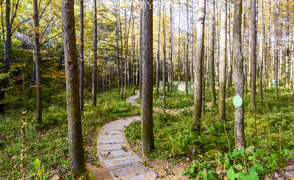 天然氧吧空气鲜,落叶松林供氧源;双眸环顾赏美景,沙路漫步享安闲;