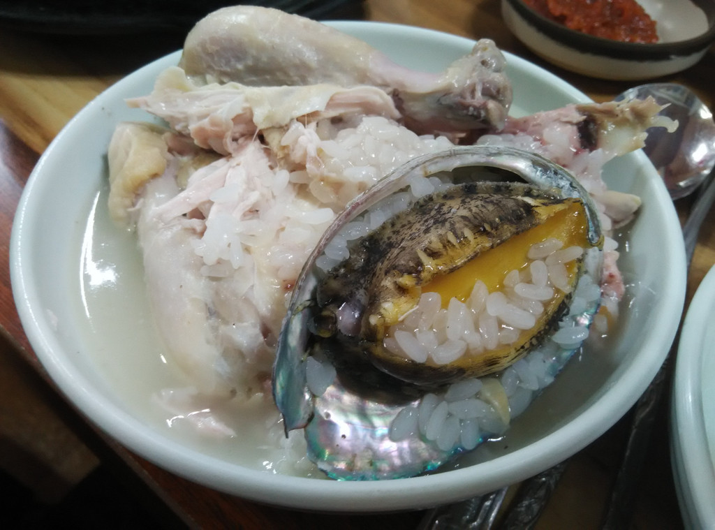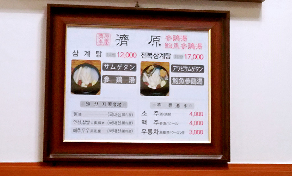 最后一天还有时间吃顿午餐,就用韩国特色的参鸡汤来收官。酒店附近有家济原参鸡汤(地址:济州岛济州市莲洞261-60号,近神话街),店面不大,是一家夫妻老婆店,这家店专注只做参鸡汤,分为加鲍鱼和不加鲍鱼两种。