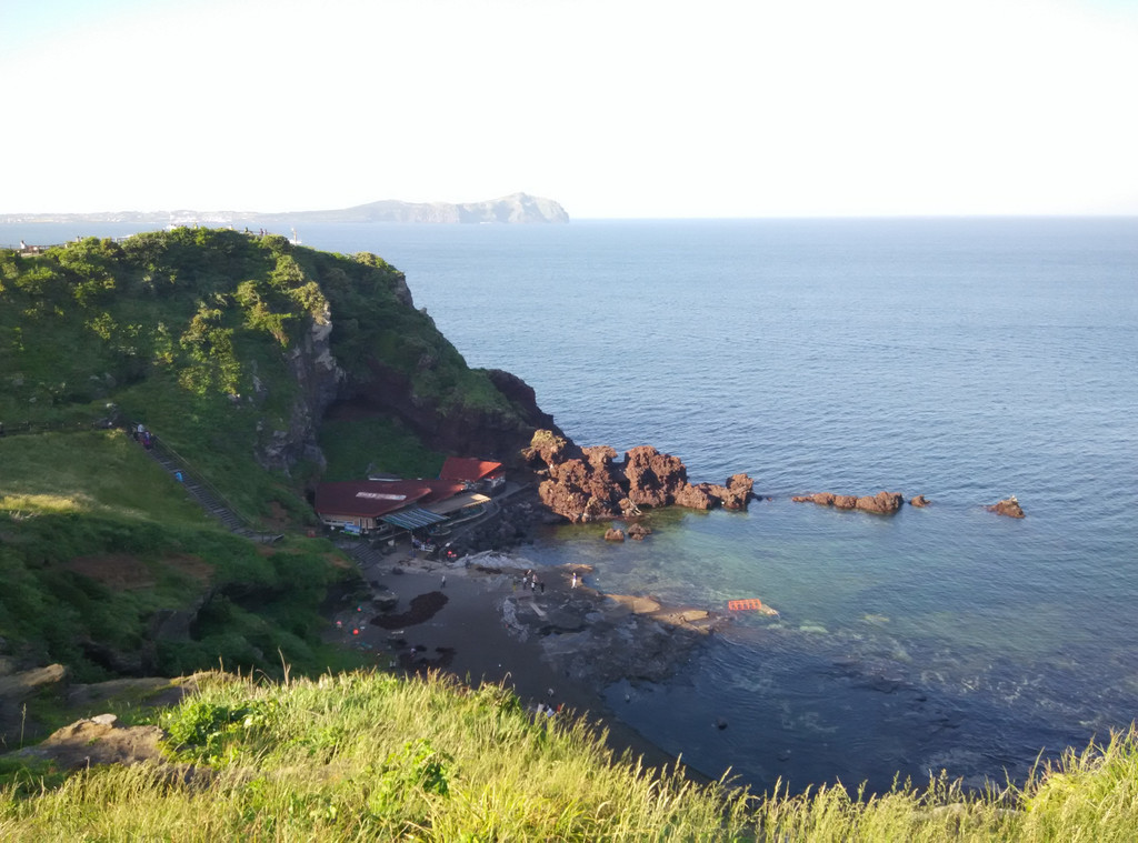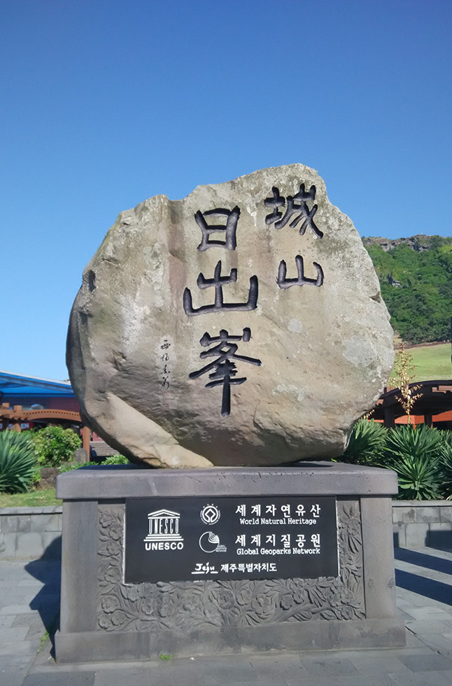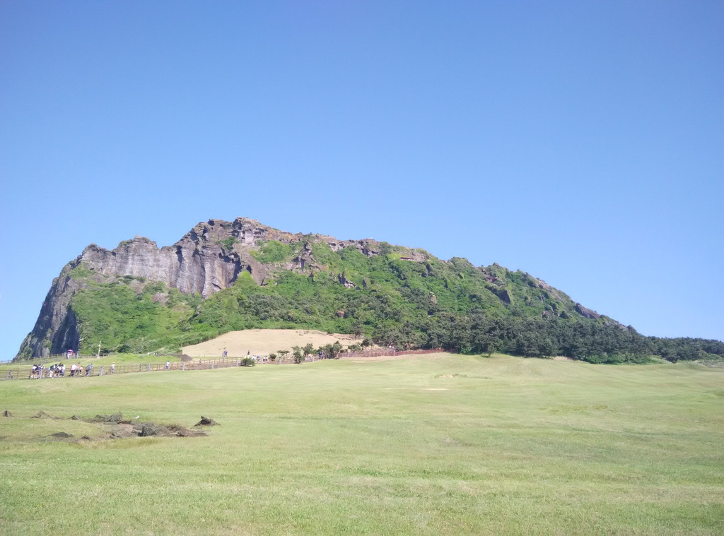 城山日出峰已被列入世界自然遗产,是济州的象征之一。它由海底火山爆发而形成,是一块高耸于海面的巨岩,其顶部有巨大的火山口,99块尖石围绕在火山口周围,远看如同一顶巨大的皇冠。城山日出峰海拔182米,从山脚爬到山顶大约需要半个小时,站在山顶可以俯瞰山下多彩的植被以及火山喷发留下的遗迹。在这里不仅可以爬山还可以骑马,山脚下就有骑马场;另外还有下到海边的小路,约5-10分钟就可以到达海岸边,这里在天气晴朗的条件下会有海女表演,还可以乘快艇出海,体验海上的速度与激情。