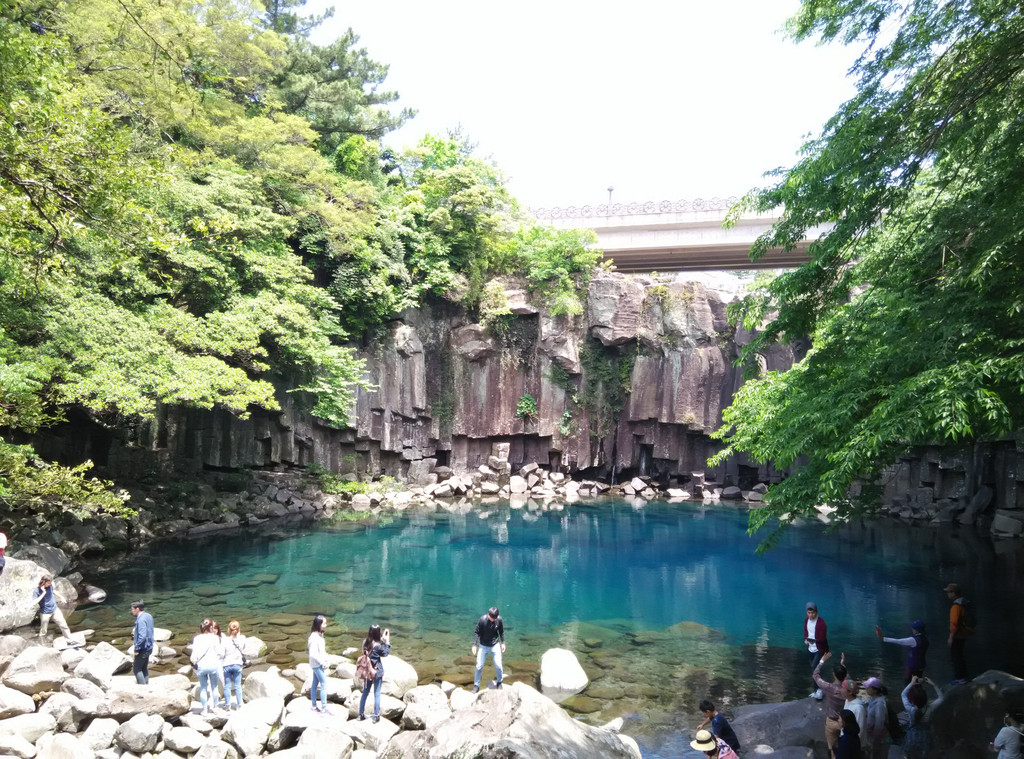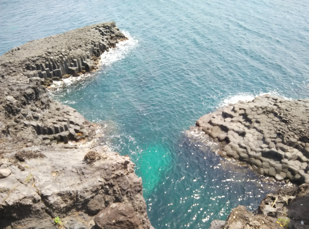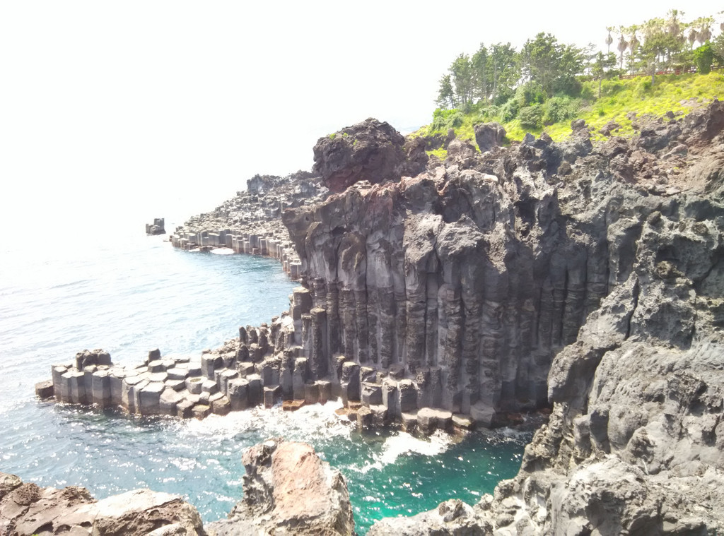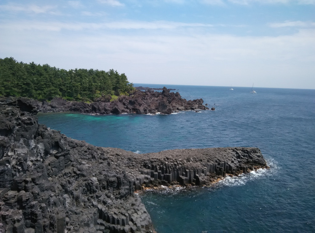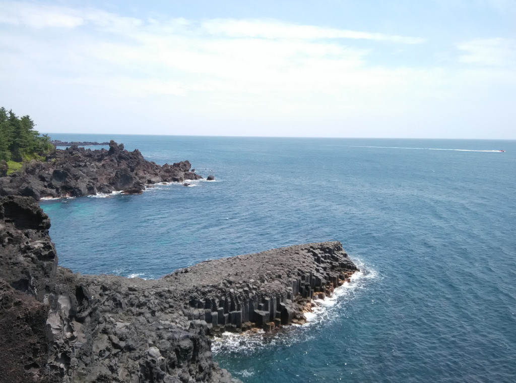第一站是大自然的奇观——柱状节理带(????)。所谓柱状节理指的是出现于玄武岩质熔岩里的垂直节理,大部分是多角形(一般为五、六角形)。它是岩浆从火山口喷出,流入西归浦沿岸,遇海水急速冷却,发生收缩作用的结果。此地的柱状节理高达30~40米,宽达1000米左右,其规模在韩国是最大的。火山喷发的高温熔岩遇到冰冷的海水形成了大小不一、或四方或六角形的石柱,仿佛是石匠雕凿而成,在海岸边层层堆积,独特且壮观,令人不禁由衷地慨叹大自然的鬼斧神工。这一奇特的地貌是济州岛的自然保护对象,适合远观,景色如画。这里还以惊涛击打近20米高的悬崖以及海边垂钓而闻名。