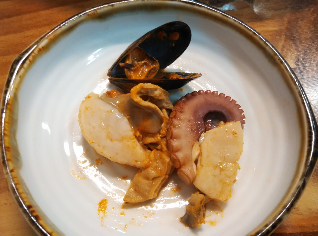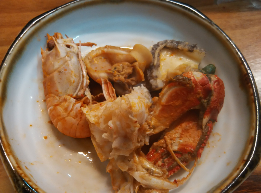 终于轮到我们了,点了个小份海鲜锅,锅子上来之后先不要急着动手,且看一锅非常新鲜的海鲜放在面前,章鱼的触角还在翻滚蠕动,鲍鱼的肉足还在收缩卷曲,然后眼睁睁地看着它们被煮熟,略显残忍。。。服务员会主动根据海鲜煮熟的程度来操作去壳和剪小块,然后示意可以吃了的时候,就能开动了。