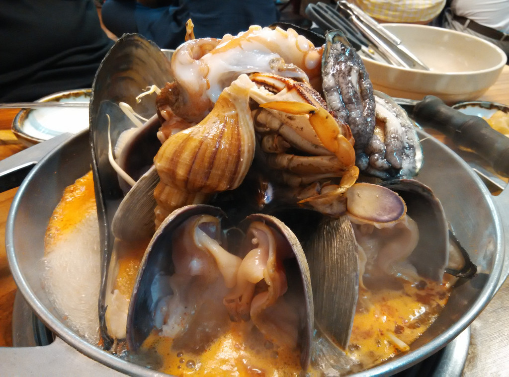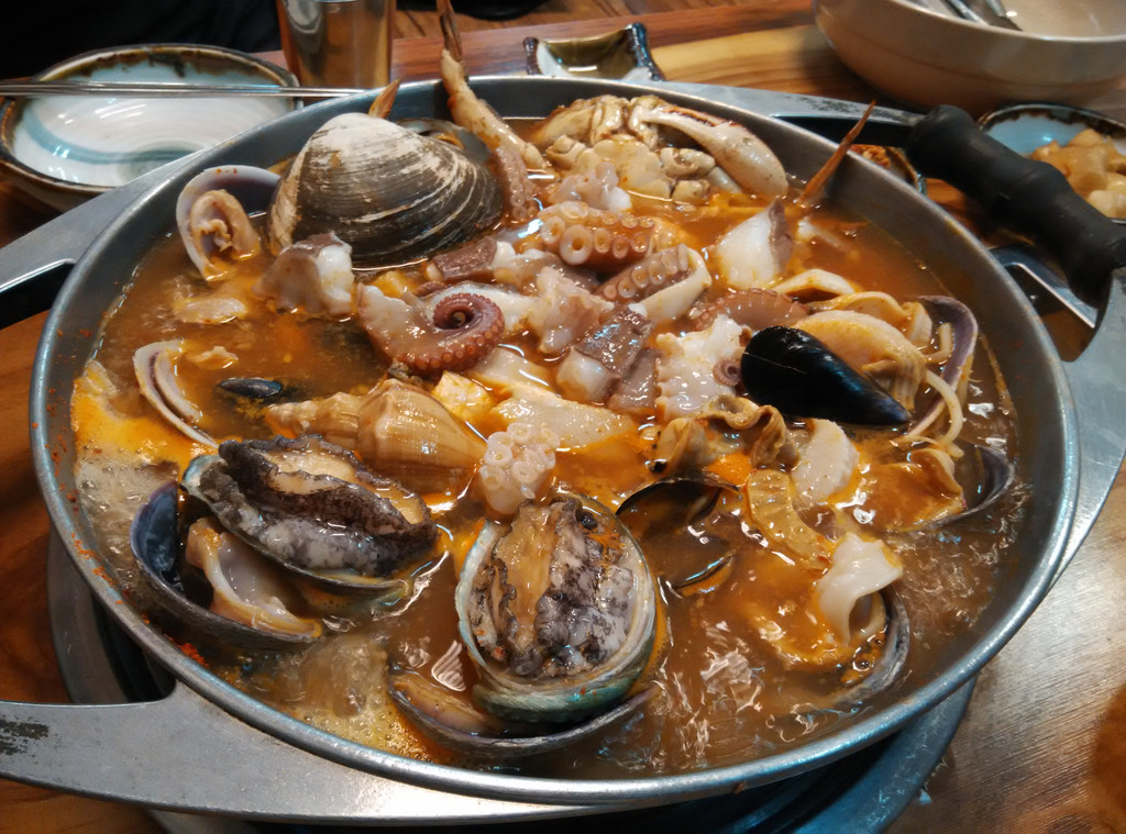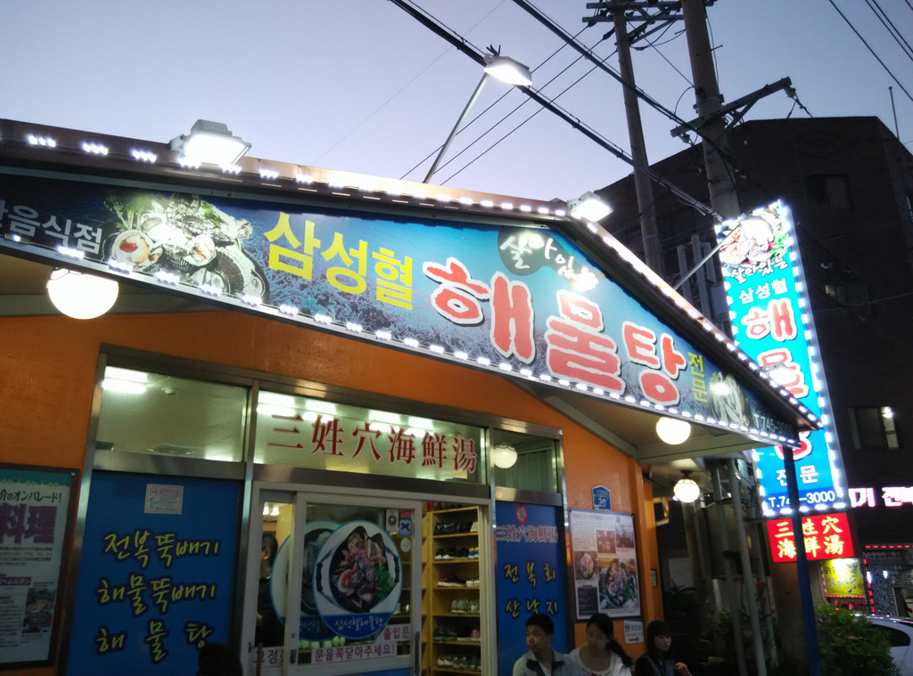 晚上吃顿好的犒劳犒劳自己。表弟推荐的三姓穴海鲜汤(??????) ,地址:济州市莲洞312-27???????????? 312-27??。由于这家营业到晚上9点半,所以8点半以后就不能入场了,要注意哦。到店和门口小哥登记姓名后在门外等,然后记住排在自己前面的人,时刻注意排队进度,就怕小哥把中文拼音读得我们都听不懂。