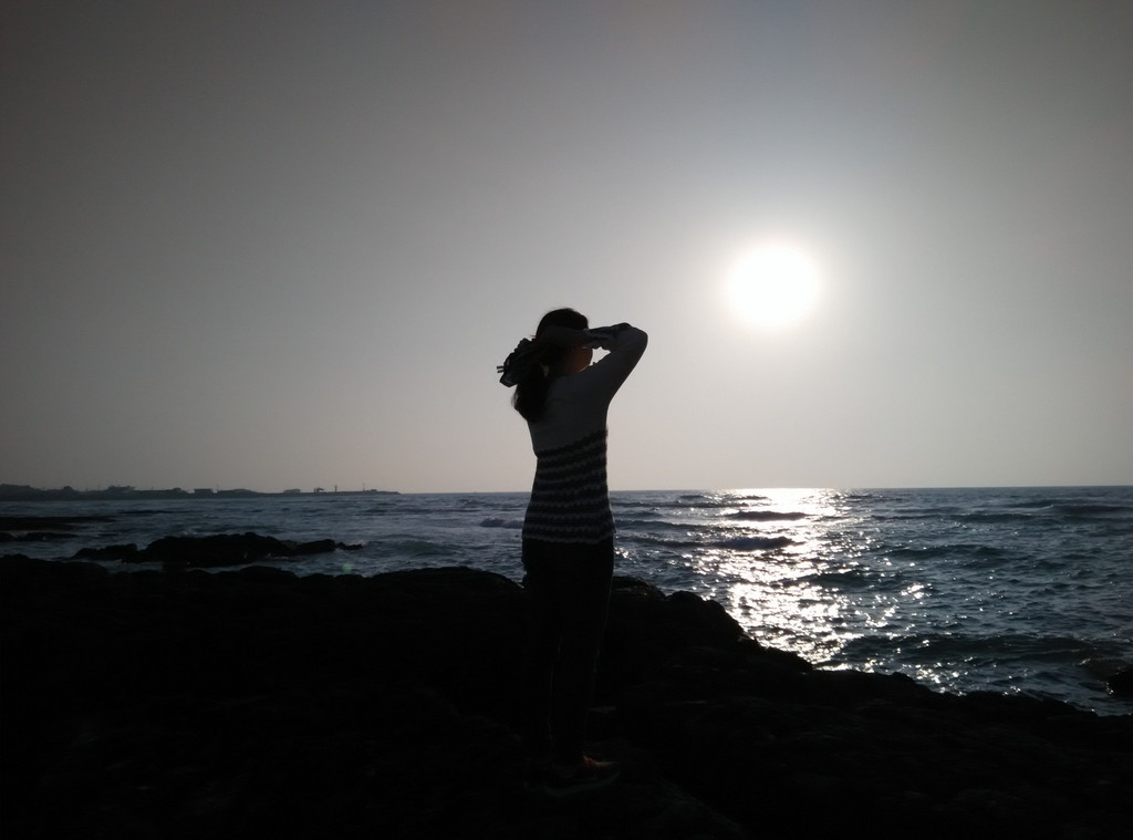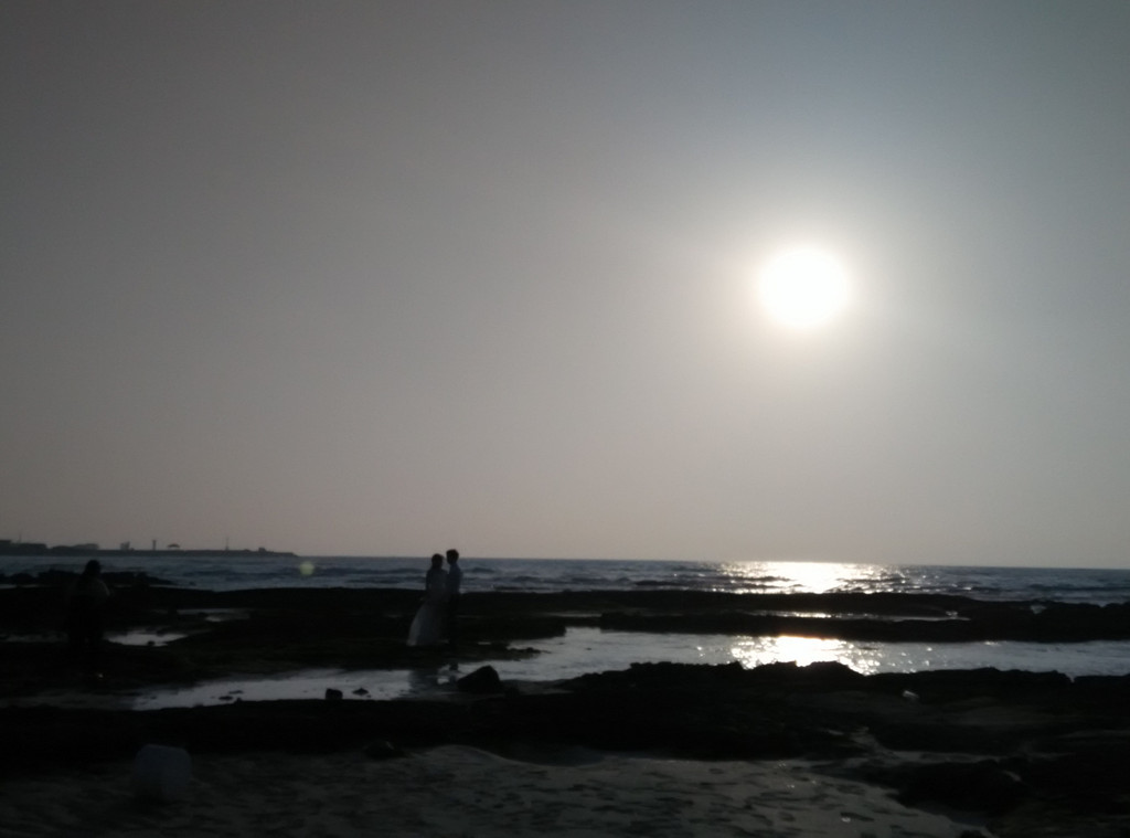 翰林公园旁边是狭才海水浴场。日落时分的海边,有新人在拍摄婚纱照,阿拉也轧闹猛凹凹造型: