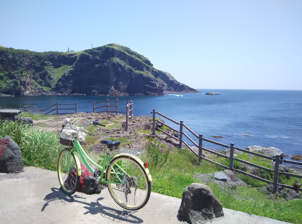 绕牛岛一圈共16公里,环牛岛有四种方式:环岛旅游巴士、步行、自驾,自行车。我们选择了环保的自行车:
