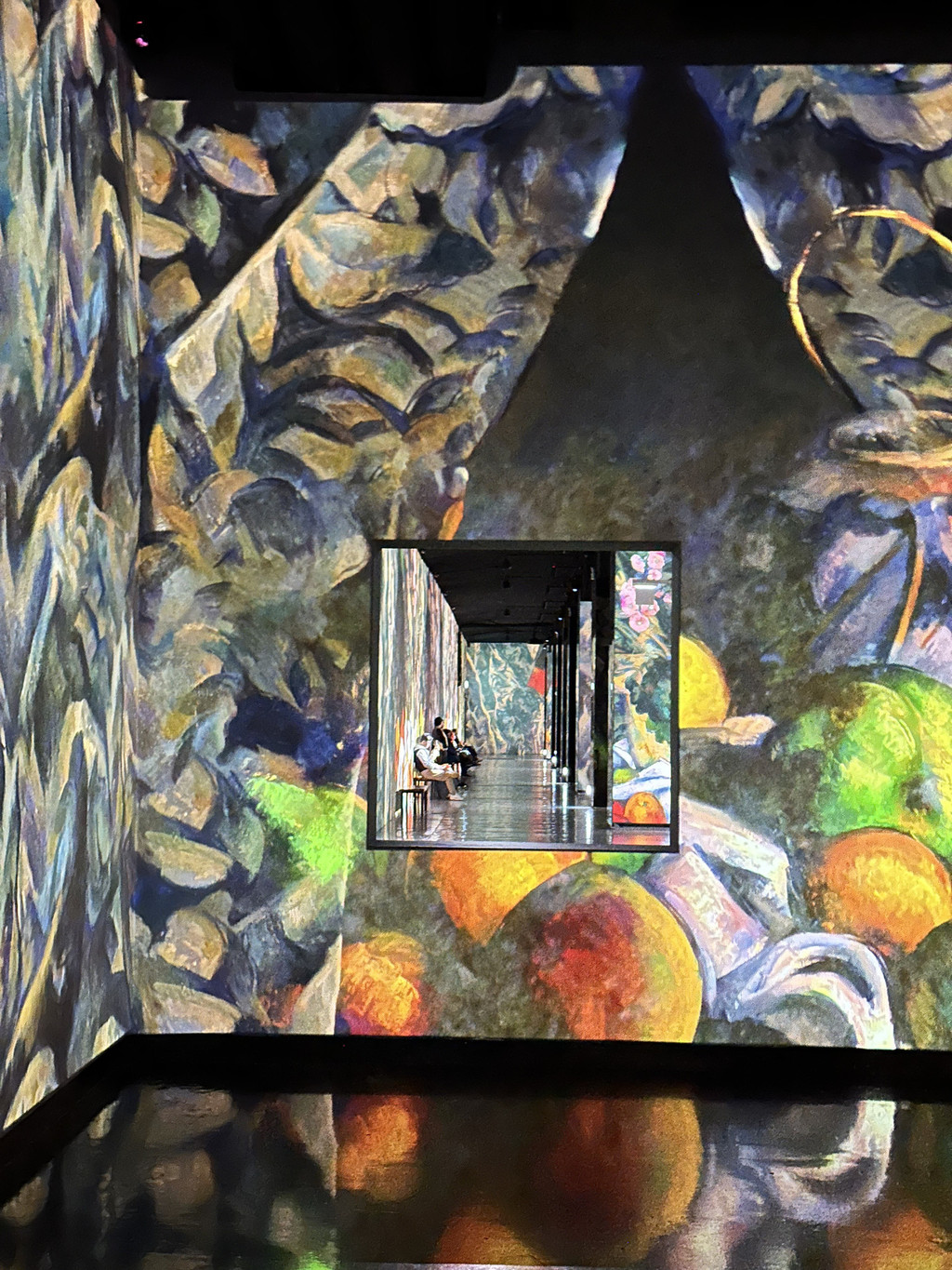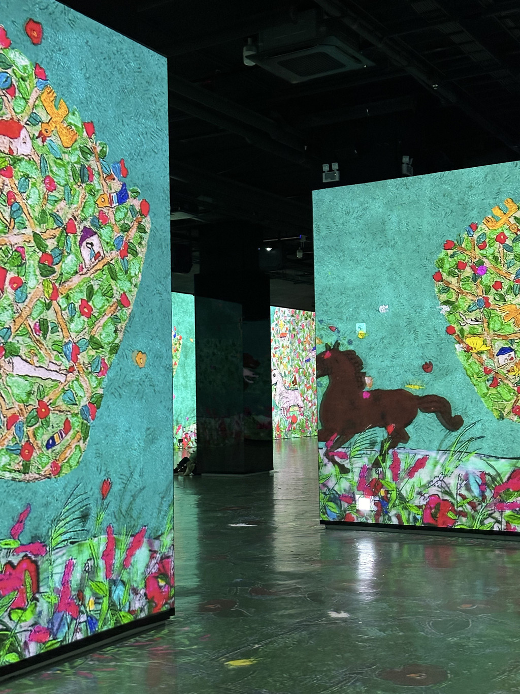 馆内正在举办韩国画家李曰鐘的《李曰鐘,中岛济州》沉浸式艺术展,这位作家是首位在探秘光影世界办展的韩国艺术家,非常擅长描绘济州岛当地的风土人情,李曰鐘用盛满生命力的色彩与创作,生动地描画出济州岛独特的自然风景和文化习俗,置身于花草树木等植物之间,能够更加深刻的理解作品中蕴含的“万物平等”的哲学思想。馆内同时还有展出法国后印象主义画派保罗·塞尚的《塞尚,普罗旺斯之光》沉浸式艺术展,可以近距离的观察塞尚作画的几何体感和视觉色彩,体会大佬对艺术的深远影响。