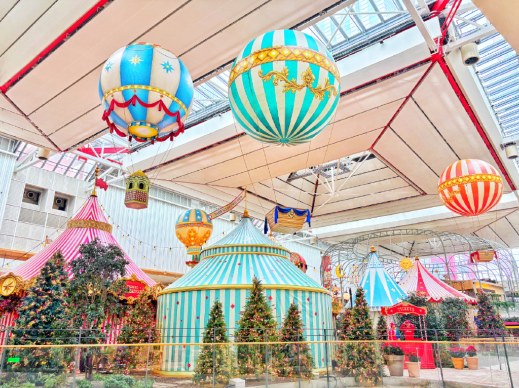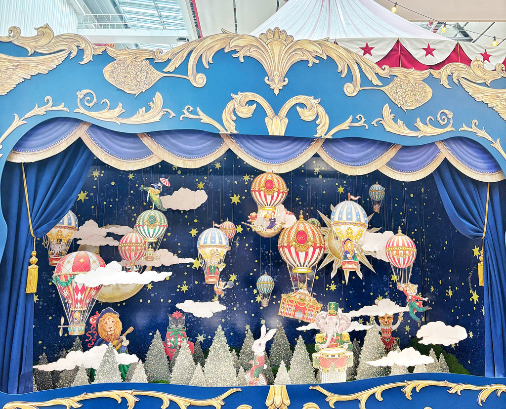 整个马戏团空间由魔术剧院、妙技剧院、音乐剧院、大剧院和店铺组成,运用各种圣诞元素组成的大型造景打造出了跳脱现实的梦幻空间。在现代百货首尔5楼的声音之林,有6个热气球飘在空中,缤纷梦幻。还有用照明装饰打造的11个马戏团帐篷,星星点点,浪漫至极。今年圣诞节的亮点就是大剧院,其中的装饰采用了洛可可风格的装饰,贝壳、花卉、葡萄藤和红色天鹅绒窗帘等可爱又奇幻的布景闯入眼帘。