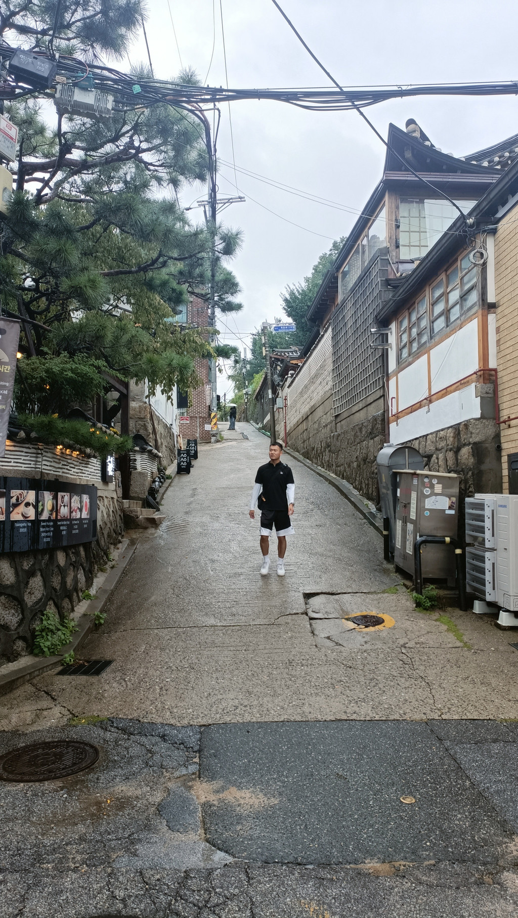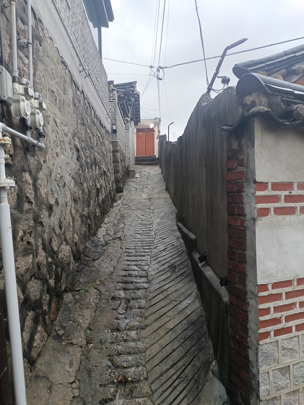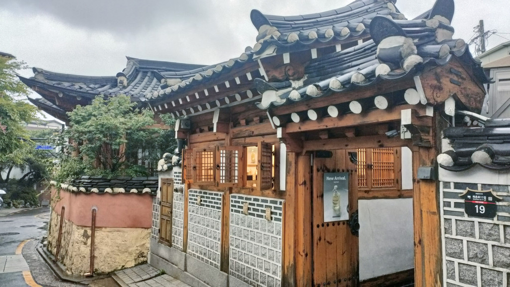 由于天公不作美,一直在下雨,如果是晴好天气,拍出的照片会更好看,而且到的比较晚,17点就不让进了,路口有个大妈在温柔的劝止,所以基本上走马观花。类似中国的古镇或保存比较完好的古村落,很好奇他们院落里留的小门是不是朝鲜人古代的真实出入所用,小的只能容一个瘦子弯腰通过。可能是因为下雨和工作日及时间晚,游人并不是很多,如果再有机会,一定要从容的逛逛。晚上,小雨淅沥,我们纠结去哪里品尝韩国美食,在啤酒炸鸡和石锅拌饭中选了炸鸡,主要是考虑到Z爱吃炸鸡(其实真想品尝一下用生鸡蛋拌生牛柳的味道),同样是在一个类似韩剧中的小饭店,不大,但人基本坐满,还有着一位和韩剧里一样的老板娘,要的炸鸡和烧酒,配2份泡菜,赠了一盘爆米花是真难吃。而且,炸鸡还不如肯德基里的好吃。烧酒没喝完,Z基本滴酒不沾,就带回酒店了,想着晚上再喝(其实后来也没喝完)。