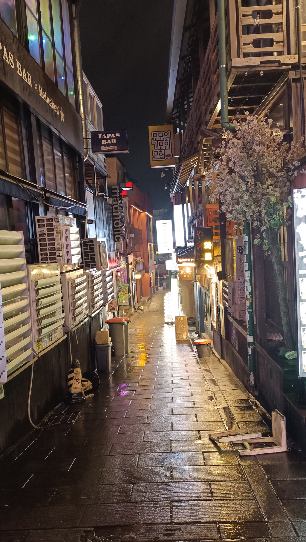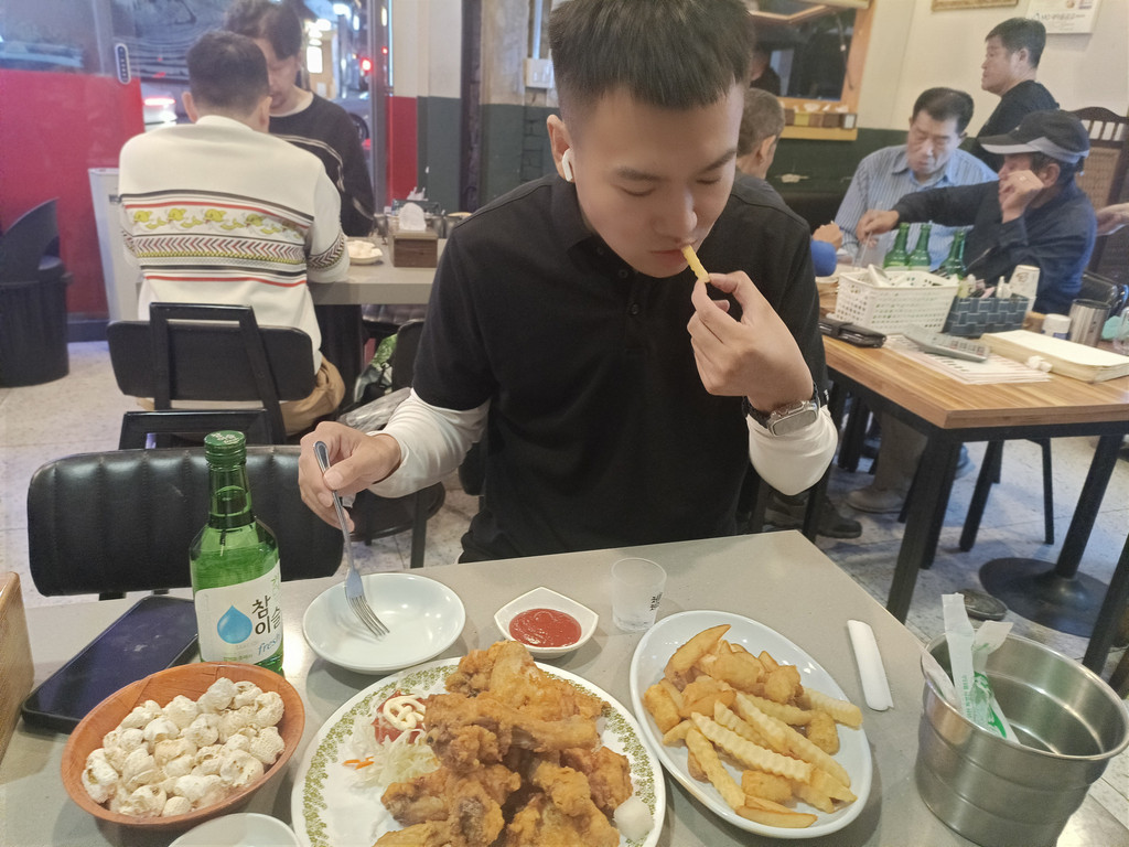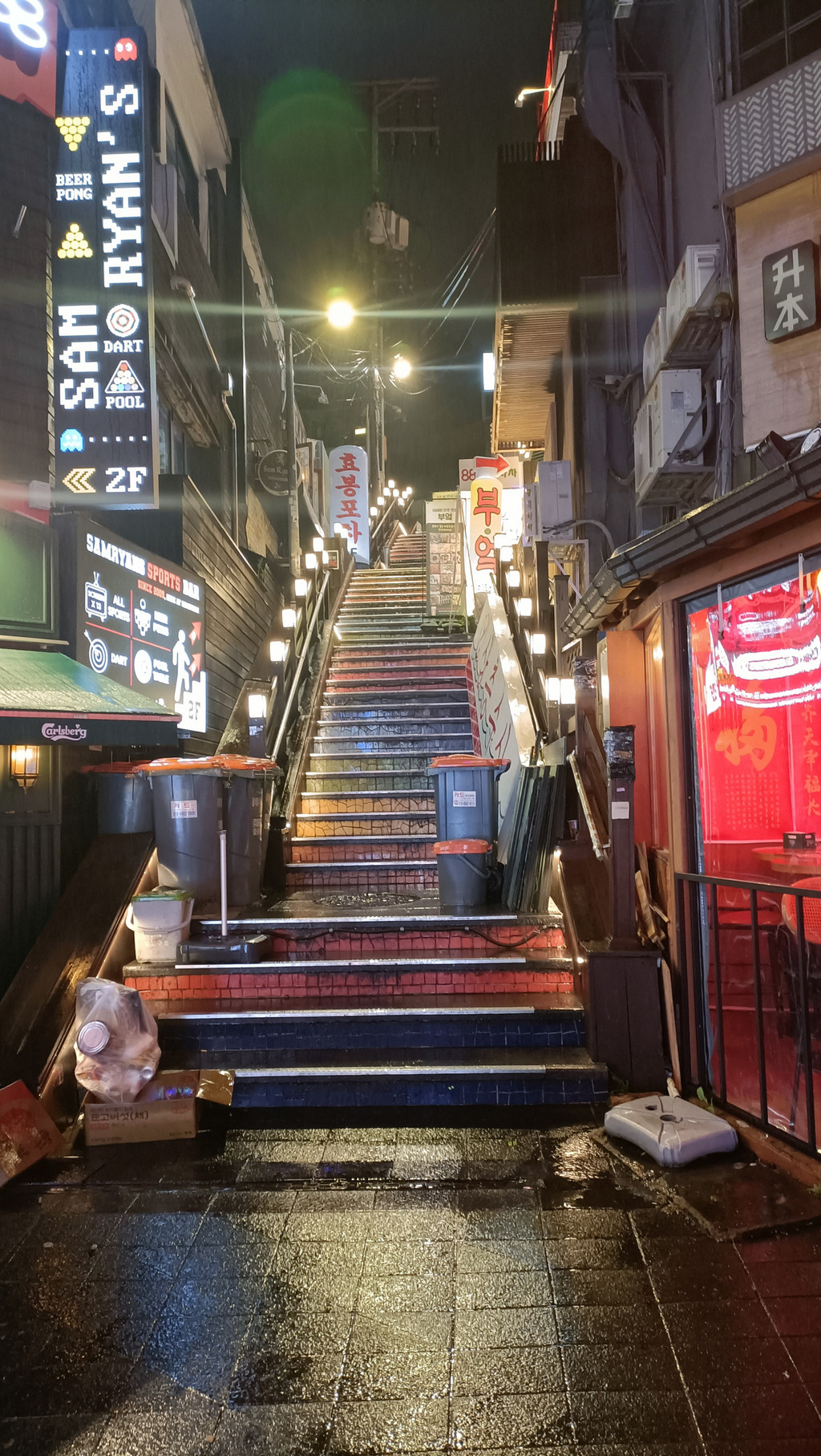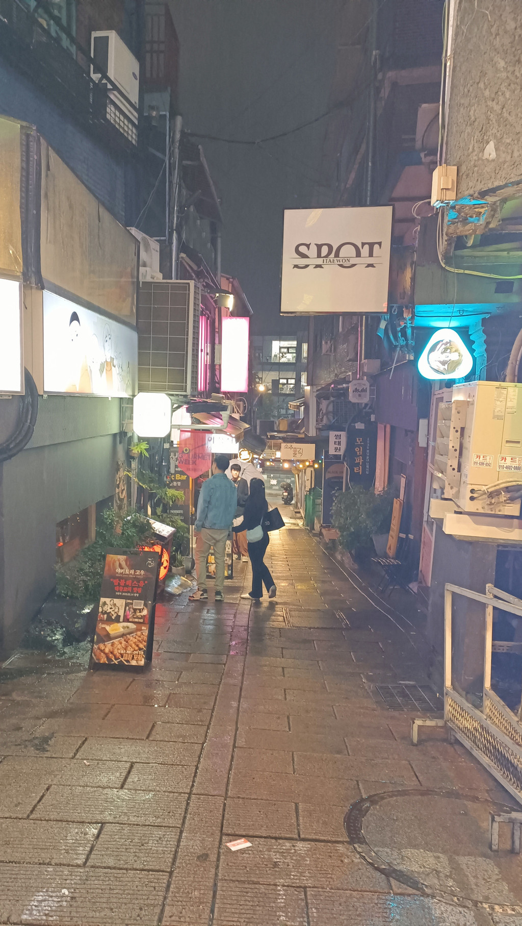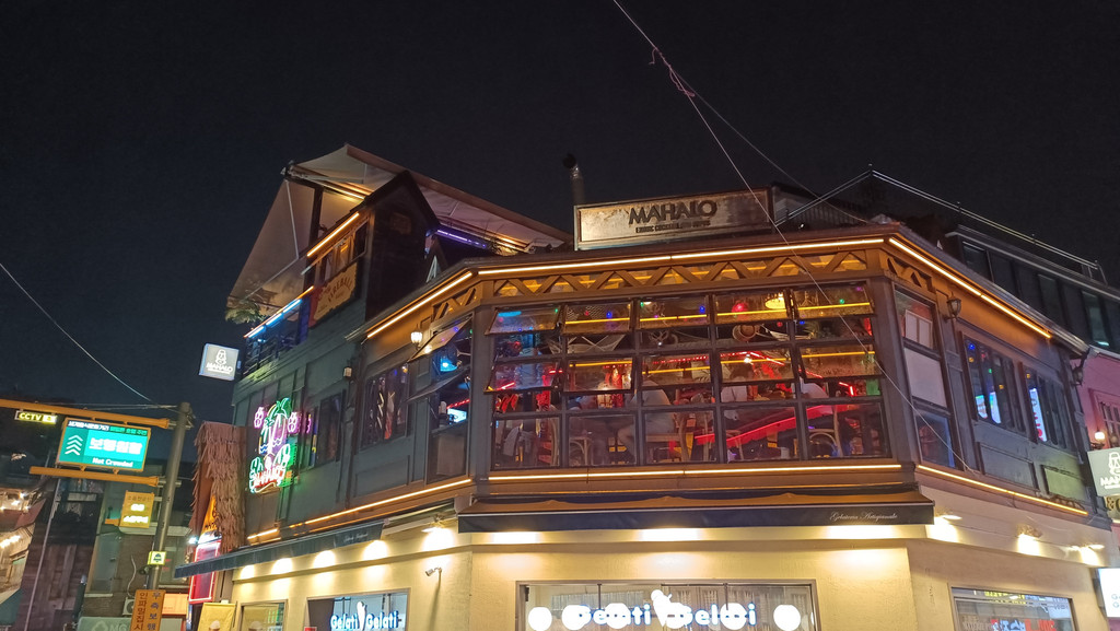 晚上,我们去了梨泰院,最早出名,是因为原来的驻美士兵经常去这里消遣、从地图上看,是一条南北方向的街道,大致从北边的梨泰院站(地铁6号线)开始,沿着一条主干道(이태원로)向南延伸,一直连接到汉江镇站(地铁6号线)及汉南洞地区。梨泰院拥有首尔顶级的夜店,音乐风格多样(Hip-hop, EDM等),吸引了众多时尚年轻人和外国人,是夜猫子的天堂。还是在一个半坡上,酒吧、餐厅和店铺主要分布在这条主干道的两侧以及与之交汇的无数条小巷里,形成了一个立体的、纵横交错的娱乐区域。据说原来是驻韩美军寻欢作乐的场所,逐渐发展至今。
