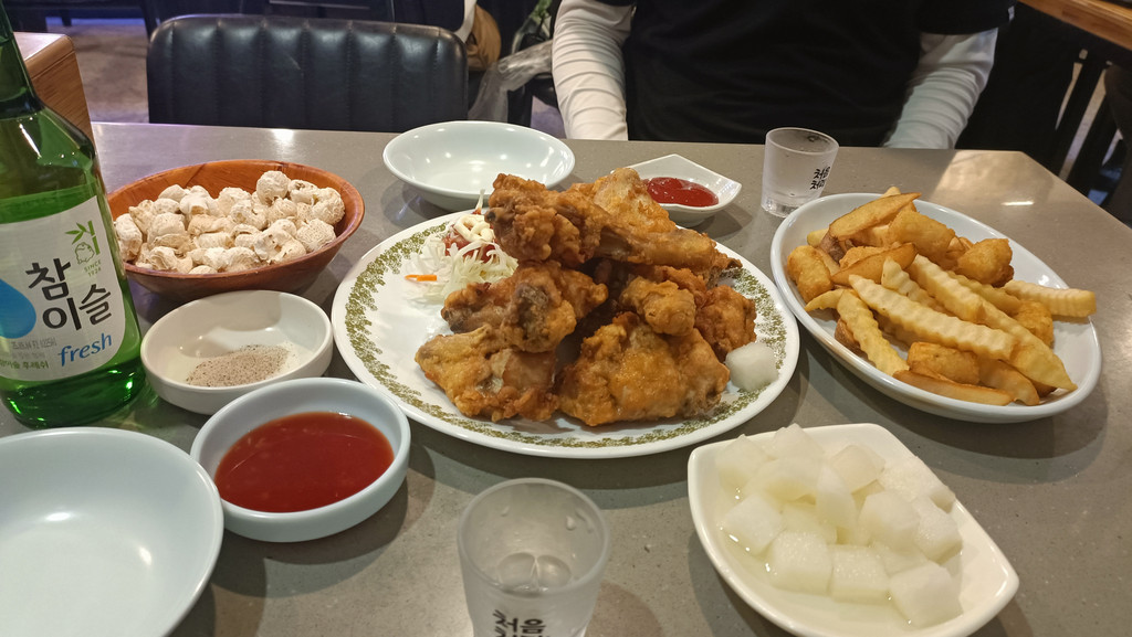 就这些,我们俩都没吃完。韩国的物价是太贵了,这顿饭,大概350元,比国内至少贵100。半夜回来,Z说没吃饱,买一份炸鸡,就120多。