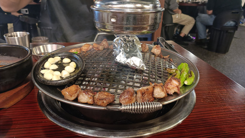 既然到了韩国,怎么能不去吃烤肉呢。搜了半天,发现酒店门口就有一家看着设施很好的烤肉店,听着里边说话的都是韩国人,应该是本地人常去的饭店。我们进去,虽然语言不同,但是他的菜单上标着部分中文,勉强可以看懂。这家店,要求菜品要点双份,本想着一样点一份,都品尝一下。我要的梅花肉,牛肉,蘑菇,还有冷面。一会桌上摆满各式各样的小碟子,这些就是构成风味的基础。有绿色的紫苏叶,也有用生菜叶的,还有蒜片 一种青椒,烤过的蒜片香甜软糯,生蒜片则辛辣刺激,是烤肉的灵魂伴侣,能解腻增香。青阳辣椒圈提供清爽的辣味,进一步平衡肉的油腻感。韩国吃饭,啥都上泡菜,萝卜、白菜,据说很健康,无论是烤着吃还是直接包在肉里,发酵的酸辣味都能完美地激发肉的香气。凉拌笋丝、还有一种腌制的不知道是啥,提供不同的口感和风味,让整个烤肉过程充满变化。通常会有三种主要的蘸料:盐和香油碟:简单的麻油和盐、芝麻混合,最能品尝到优质肉类(如韩牛)的原汁原味。