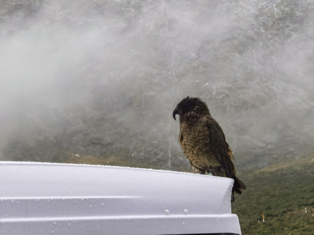 去米福峡湾游玩最好是雨天,因为只有大雨才会有飞流直下三千尺的效果,会更好看。所以今天王半仙休息,云姐姐雨神上线。穿过一个隧道,停车休息,路边有好多鹦鹉,可能是知道有人会喂食,都聚集在一起,还跳到车顶上散步,趴在车窗前要吃的,胆子巨肥。