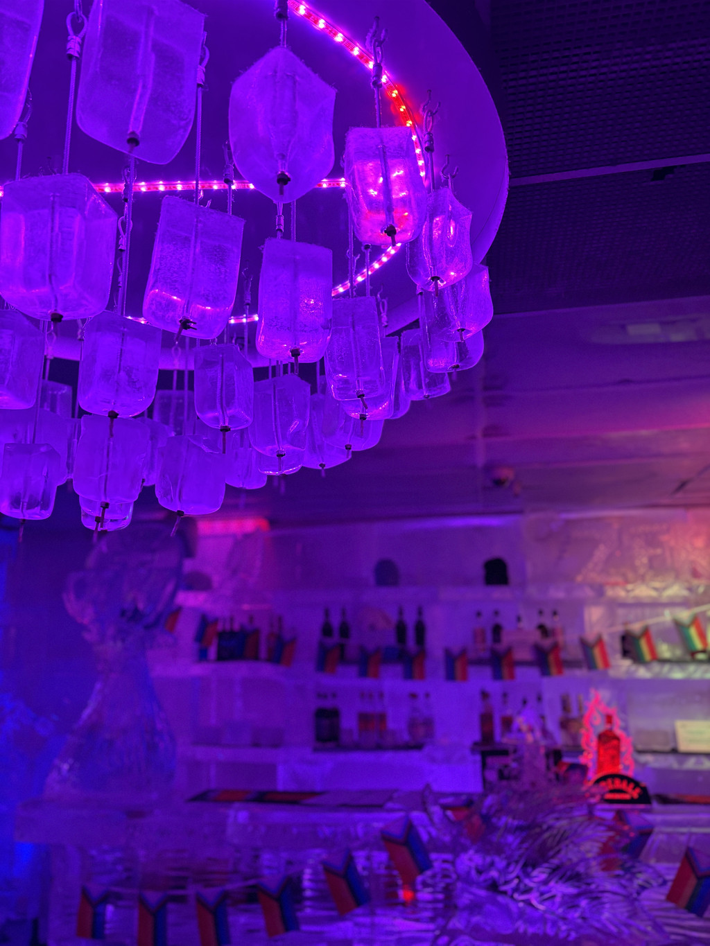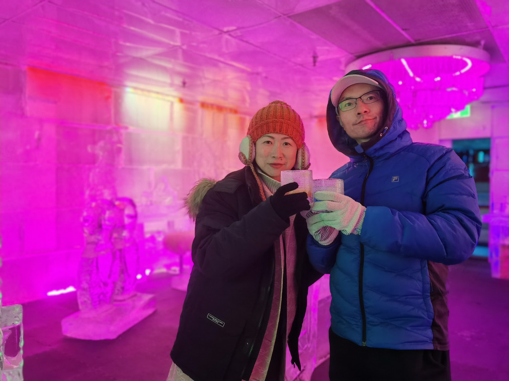 下午,我们约了4点的冰吧体验,21刀每人一小时,含一杯酒水饮料。进去之前工作人员会给你一副手套,如果穿的不够厚,那里也会有羽绒衣提供,毕竟是零下12度的酒吧,还是多穿点。