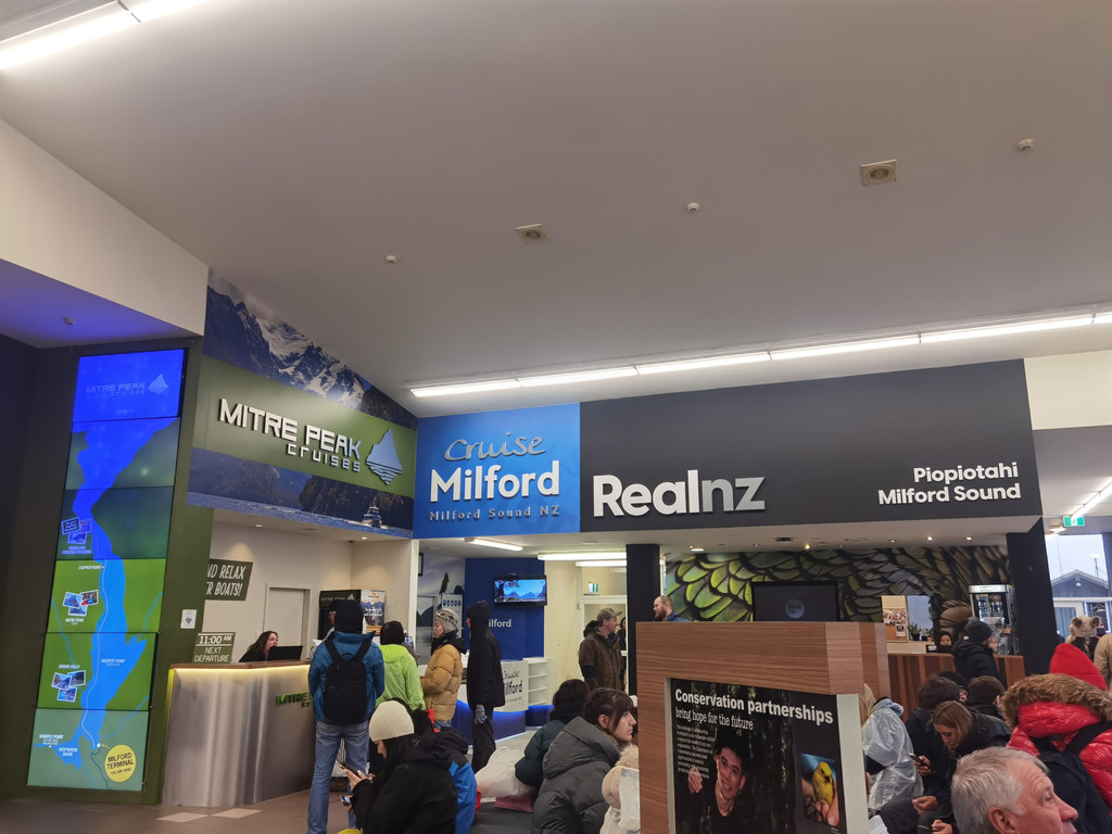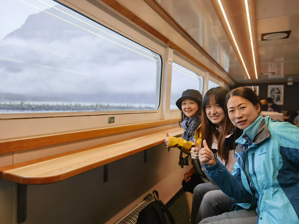 果然今天是雨天,而且越下越大,当我们抵达峡湾时,整个游船码头被云雾笼罩,烟雨迷蒙,若隐若现,好仙的感觉。我们预定的是11:00的游船,125刀每人,据说是艘网红船,但是没有中文翻译。