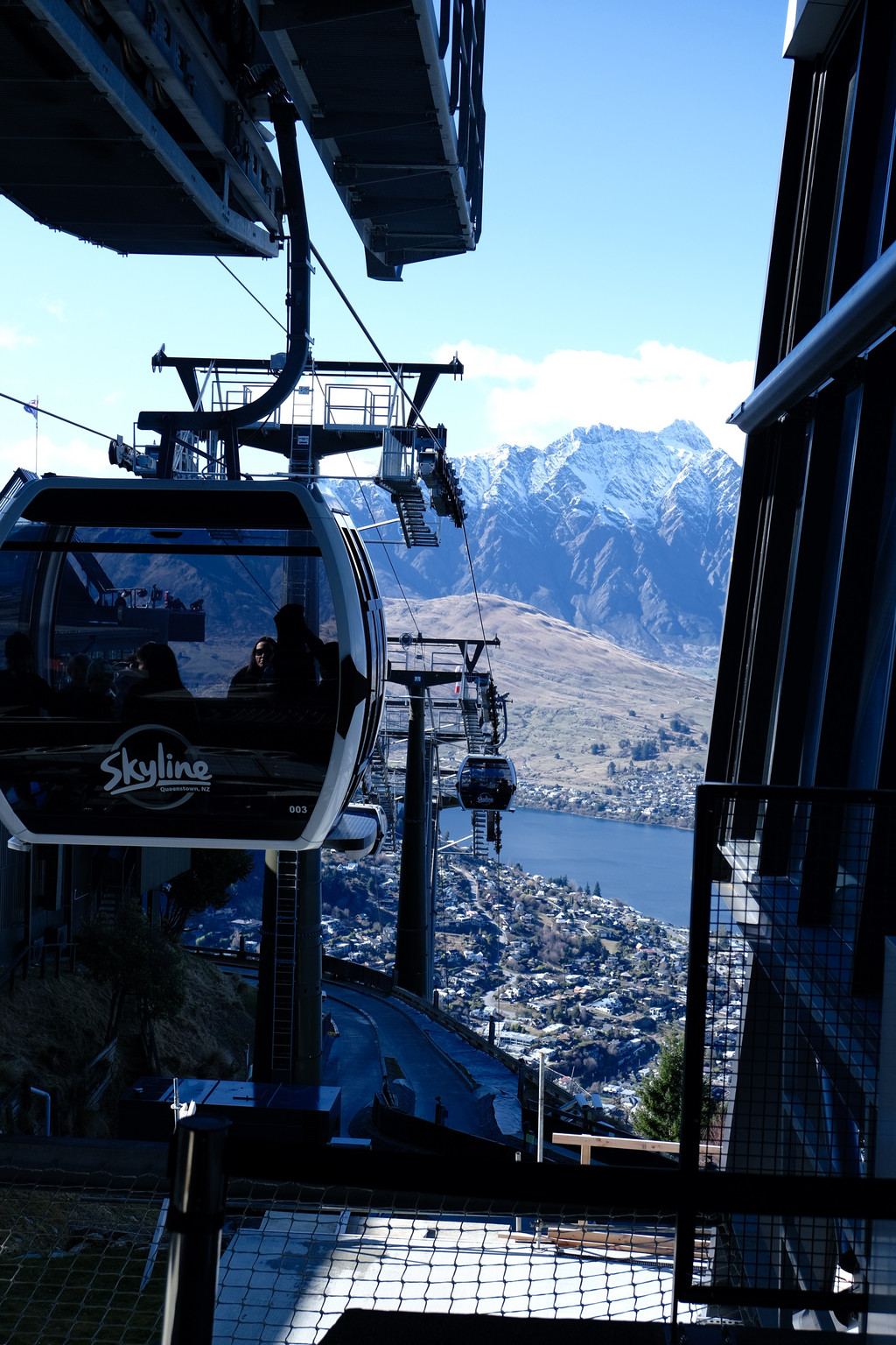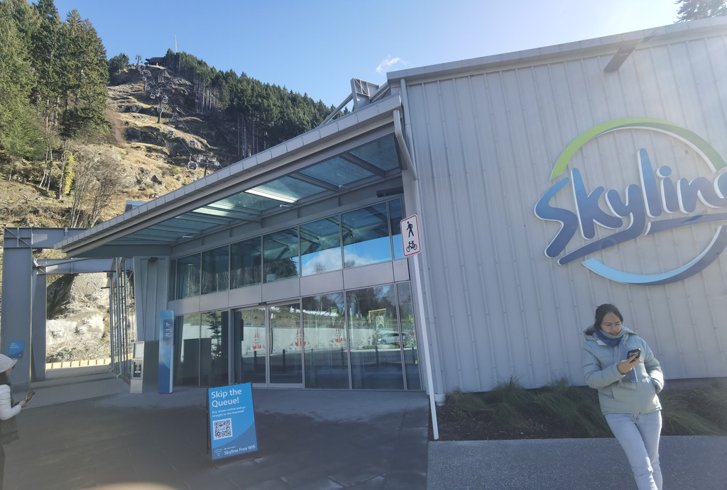 随着视角越升越高,瓦卡蒂普湖和皇后镇的美景完全展露在眼前。到了最顶端的观景平台,工作人员会邀请你在最佳的拍照地点拍照,这里的摄像头装在很高的位置,从上往下拍,不仅能拍到人,还能拍到美丽的湖景。我们不仅拍了集体照,还挨个拍了单人照,然后工作人员会给你一张带二维码的卡片。