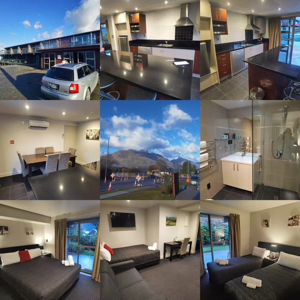 大约傍晚6点,我们来到了皇后镇的驻地 Autoline Motel (2/4 Dublin Street, Queenstown, Otago, 9300,NZ),我们预定的是一个两卧室的山景公寓,6个人住三晚8600元人民币。皇后镇是新西兰的旅游胜地,也是户外极限运动的圣地,现在冬季来这里滑雪的游客很多,现在也是一个小旺季,所以住宿很贵。我们的这一套小公寓在半山坡上,厨房超级大,可以自己烧饭,有两个卫生间,6个人住还是很舒服的,性价比也很高。