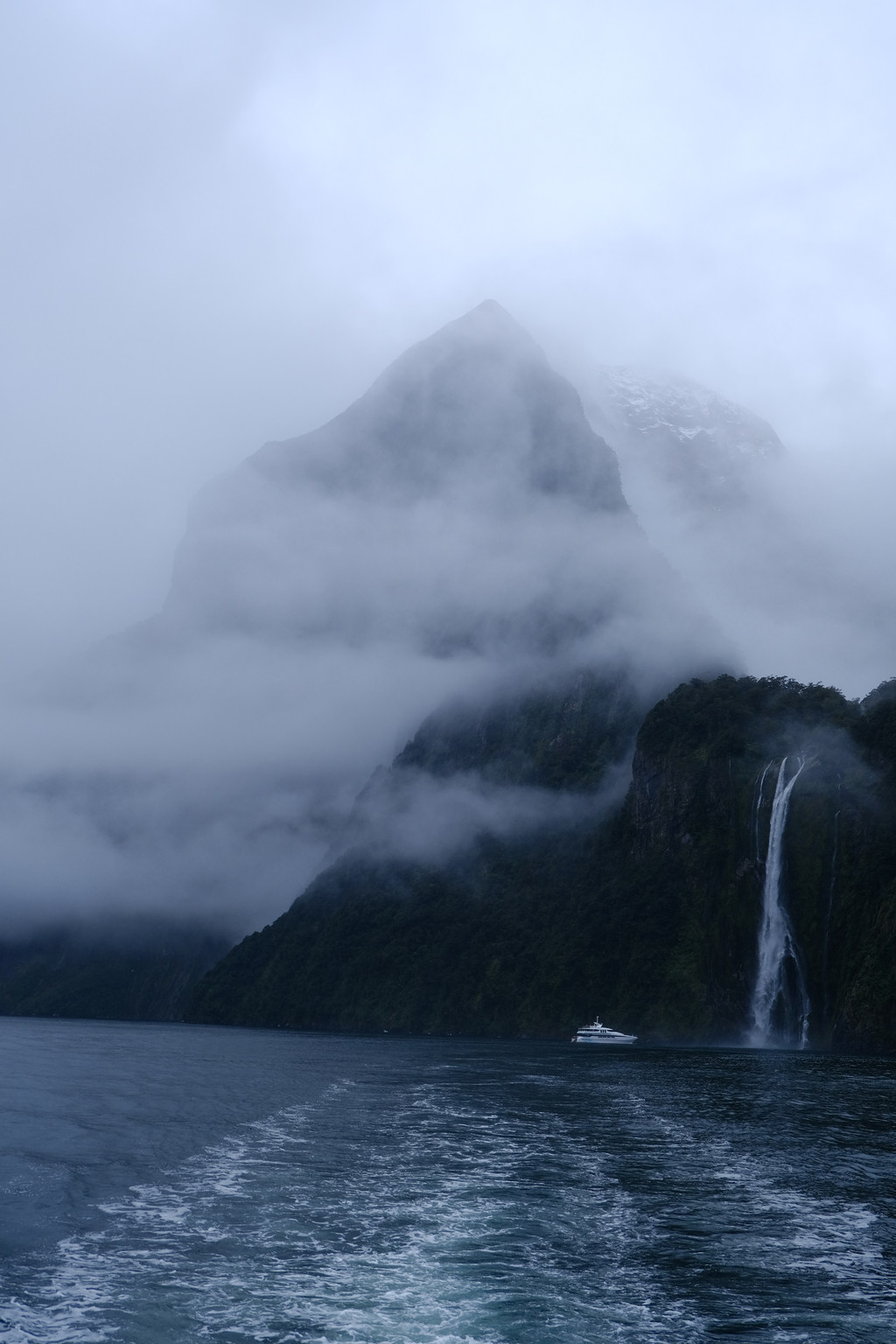 游船整点出发,在湖面上缓缓的行驶,米弗峡湾慢慢的向我们展示了它的盛世美颜。水面上雾气很大,把高山环绕的如仙境一般,从山顶飞流而下的一条条瀑布煞是壮观,真有飞流直下三千尺,疑是银河落九天的感觉,而这里最大的看点是一排排瀑布飞流直下,雨量越大,瀑布也越大,非常壮观。