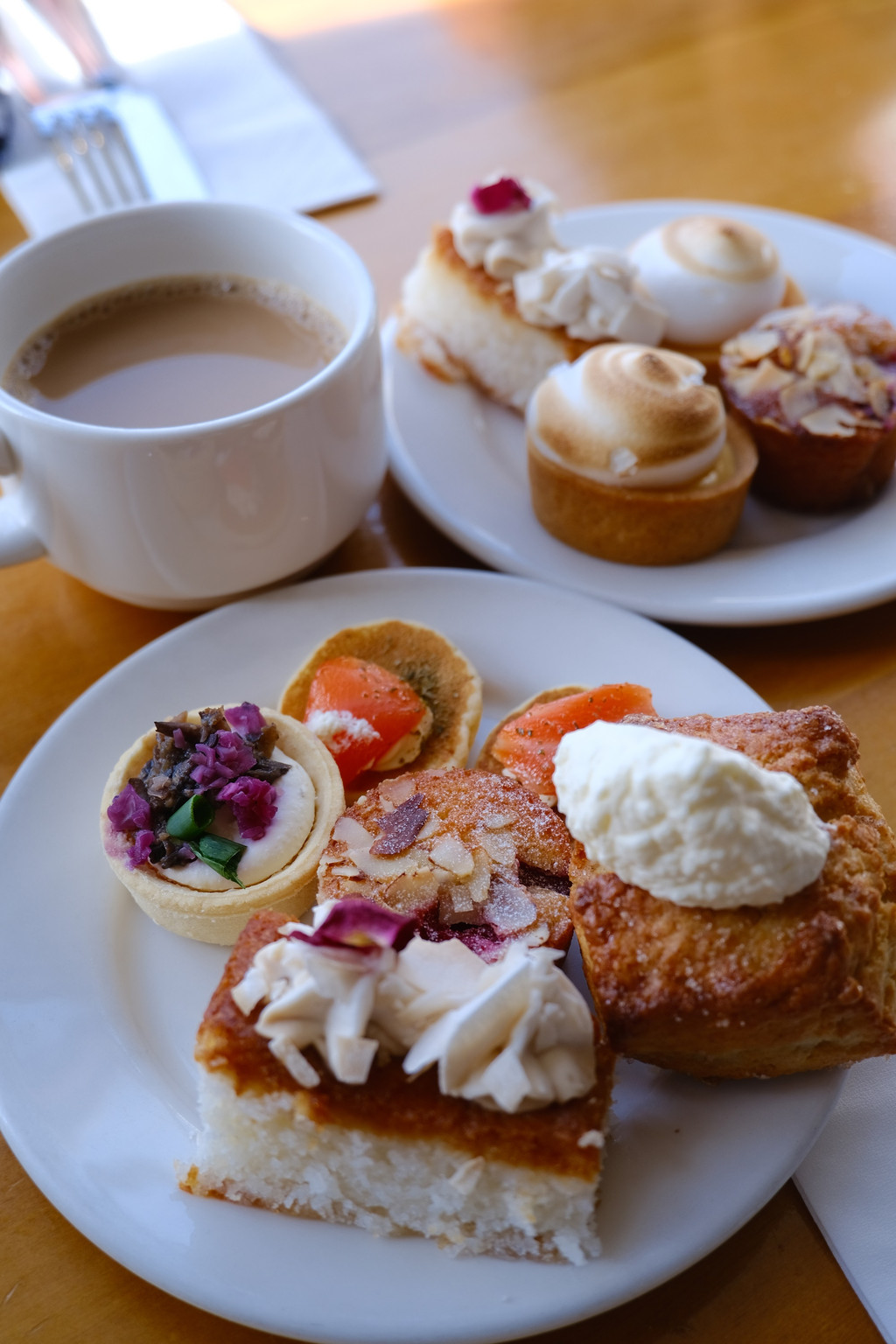 这里的牧场特别整洁,没有浓重的动物的臭味儿,更像是一个大花园。参观完牧场,我们随着人群往湖边一个房子里走,这里是喝下午茶的,我们还不确定有没有吃,韦老板去问了一下,果真有我们的名字,连座位都是安排好的,原来牧场秀的门票里含了一顿下午茶,顿时让我们感到惊喜。咖啡、红茶、柠檬水,还有黑松露塔、三文鱼塔、柠檬塔、椰子杏仁蛋糕、三明治等七八种不同味道的小甜点,大家吃的特别愉快。哈哈哈,幸亏早饭吃的晚,我们没有吃午饭,这回赚了。