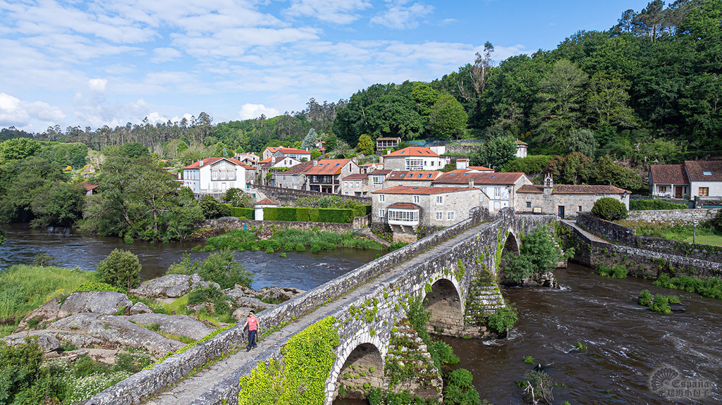 该桥建于中世纪,其建筑风格体现了罗曼式建筑的典型特征。桥梁结构坚固,由石材砌筑,拥有多个桥墩和拱洞。历史上,它曾是朝圣者和当地居民跨越坦布雷河的重要通道。如今,它作为加利西亚文化遗产的一部分被保留下来,继续为徒步朝圣者服务,其古朴的形态与周围的自然风光共同构成了一幅优美的景致。