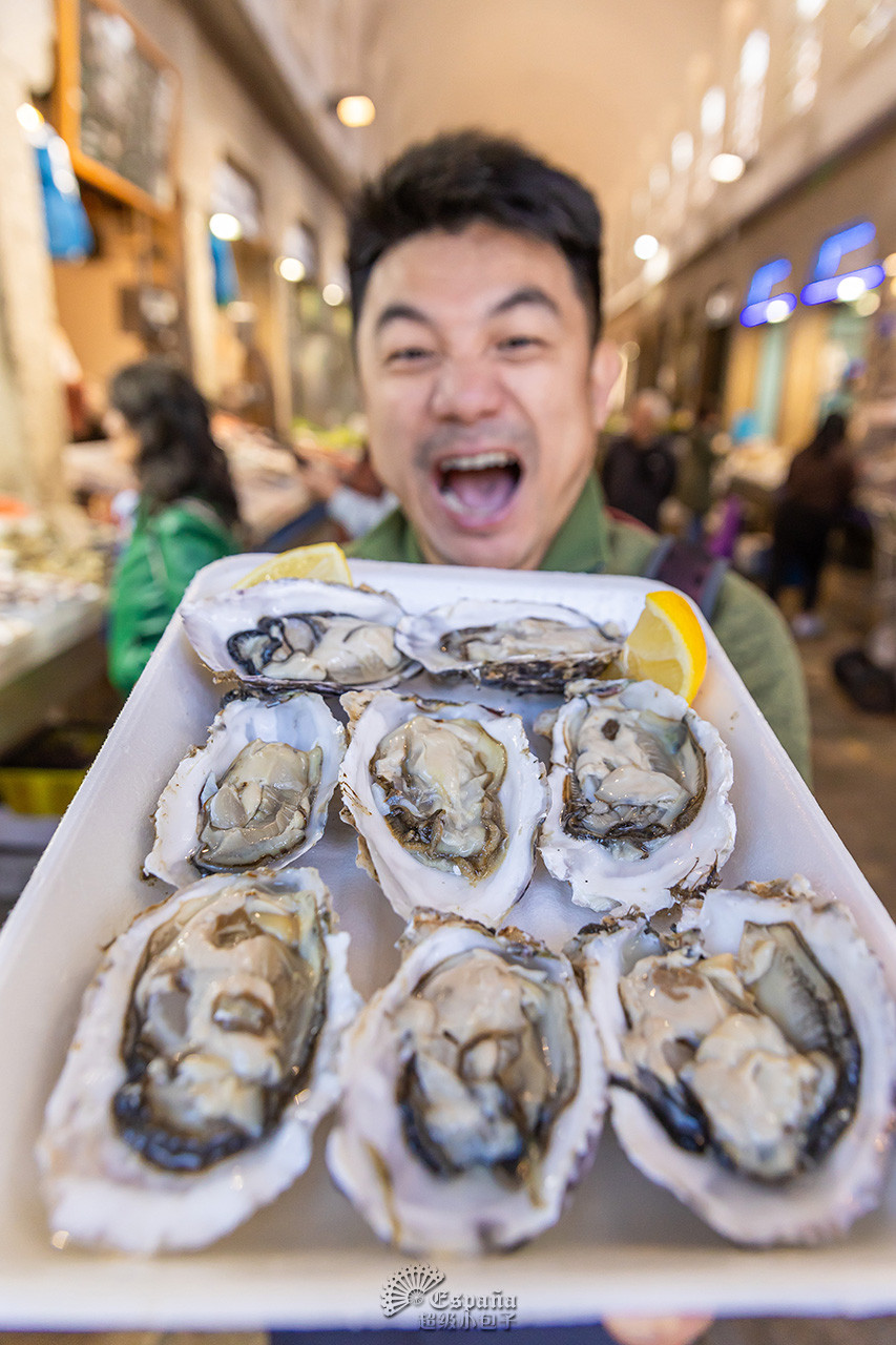 明亮的柜台里来自大西洋的海产五花八门,银光闪烁的沙丁鱼、硕大肥美的安康鱼头、堆成小山一样的青口贝……当然最诱人的,还是那些大生蚝。