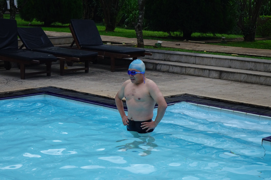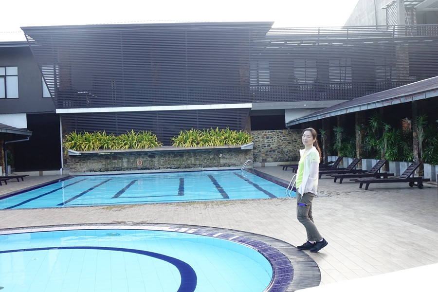 晚上住宿的酒店规模不小,游泳池水湛蓝湛蓝的,只是有点凉没敢下去,同行的老杨身体倍棒,下去酣畅了一把。