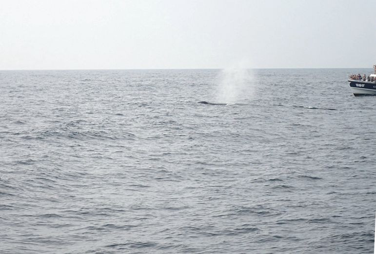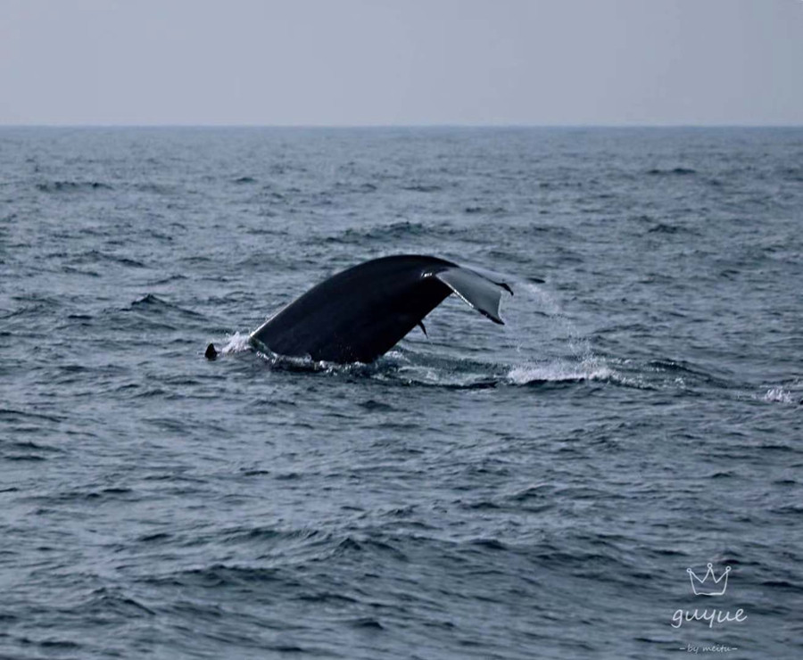 许多双层游艇,大概乘坐一百至二百人,一直向南进发,过一会能看到远远的有像农用飞机似的小飞机在那里盘旋,应该是观鲸的侦察机,游船得到指令后,拼命的全向一个地方开去,先是看到鲸鱼喷出的水花,像一束喷泉,然后大大的脊梁露了出来,足足有一间屋子那么大,等一会儿尾巴一露出来,就是大蓝鲸钻入水里,然后再等15分钟,不知道从什么地方钻出来了,一个上午远的近的大概看了有四五条鲸鱼吧。