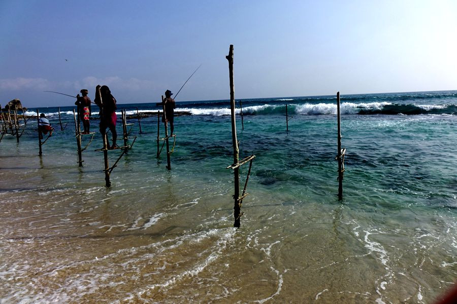 傍晚看了著名的高跷渔夫,渔民们将木杆插入海水中,涨潮时拿着长长的木棍就能钓鱼。