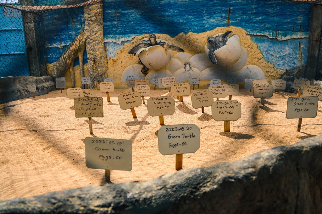 海龟抚育园内随处可见各种海龟元素,这里主要是抚育一些刚孵化出来的小海龟,提高海龟的存活率,以及救助一些大海龟。从小贩手中高价回收、被当地渔民不慎捕捞上岸、带有残疾缺陷等,难以自己生存的海龟都可以在这里得到照料。
