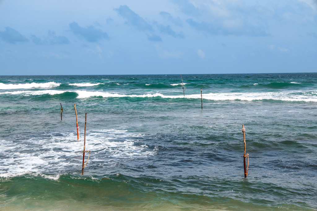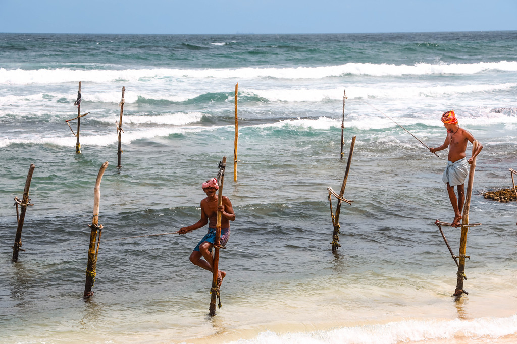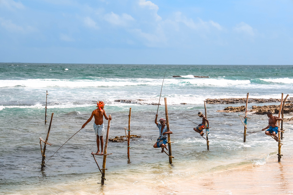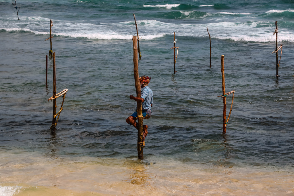 没错,这就是斯里兰卡加勒沙滩上的一道风景线。虽然现在基本都是表演性质的摆拍,但在最开始却是令人心酸的,买不起渔船的渔民为了捕到敏感的沙丁鱼,只能选择如此看起来荒谬的钓鱼方法来满足自家食用的需求。