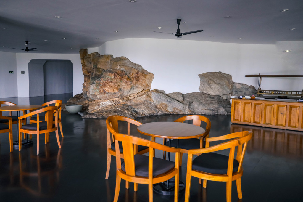 最令我印象深刻的莫过于酒店中的岩石元素,并不是从哪里搬来的装饰品,而是实实在在的岩石。修建在山最顶端的遗产酒店,依着岩石而建,据说完全没有地基,靠的是一只只加在岩石上的铁柱支撑,准确而言,它嵌在岩石之中,又不会影响当地的地貌。