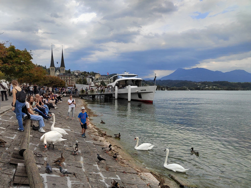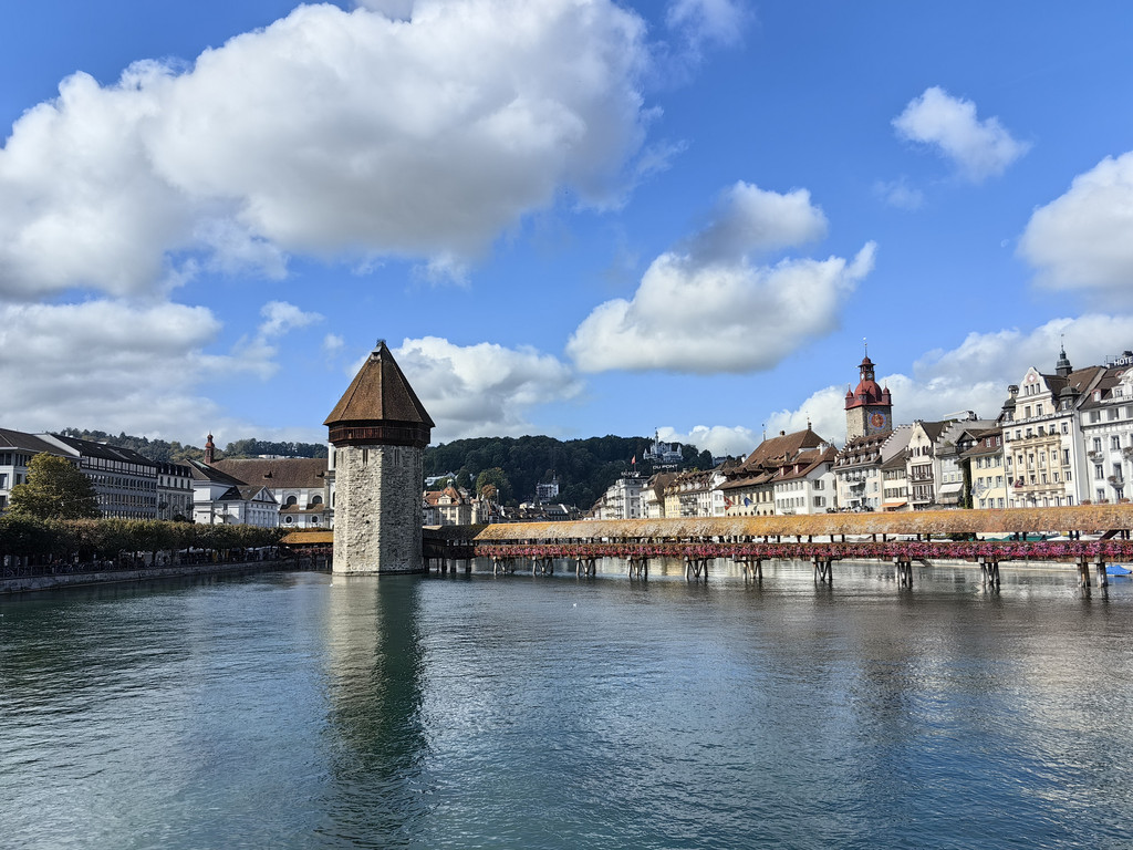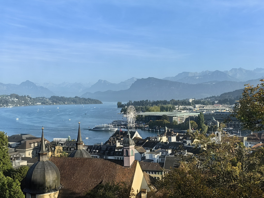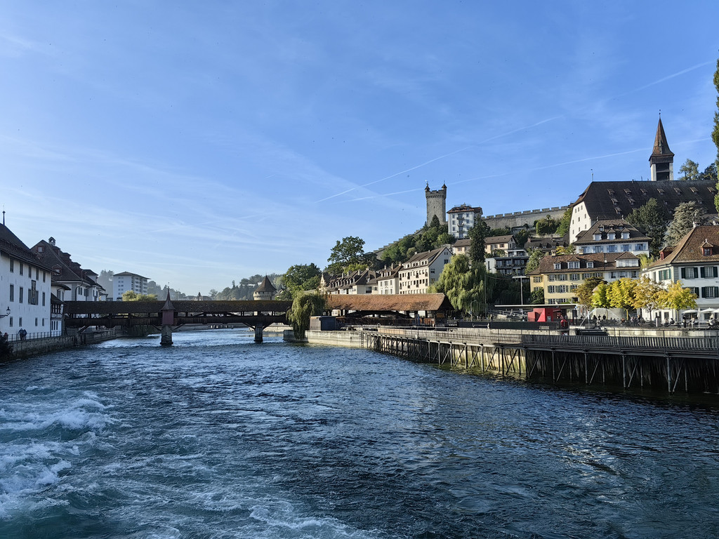 之后打点行囊坐火车去卢塞恩(琉森,住两晚),在老城区各处逛逛:坐电梯上山到小天鹅堡之称的古奇城堡酒店看全景、古老的卡佩尔廊桥(木制、彩画)、湖边悠闲游荡的天鹅、垂死的狮子雕像(纪念在1792年法国战死的瑞士雇佣兵)、古城墙(一段古老的中世纪城墙)、教堂......