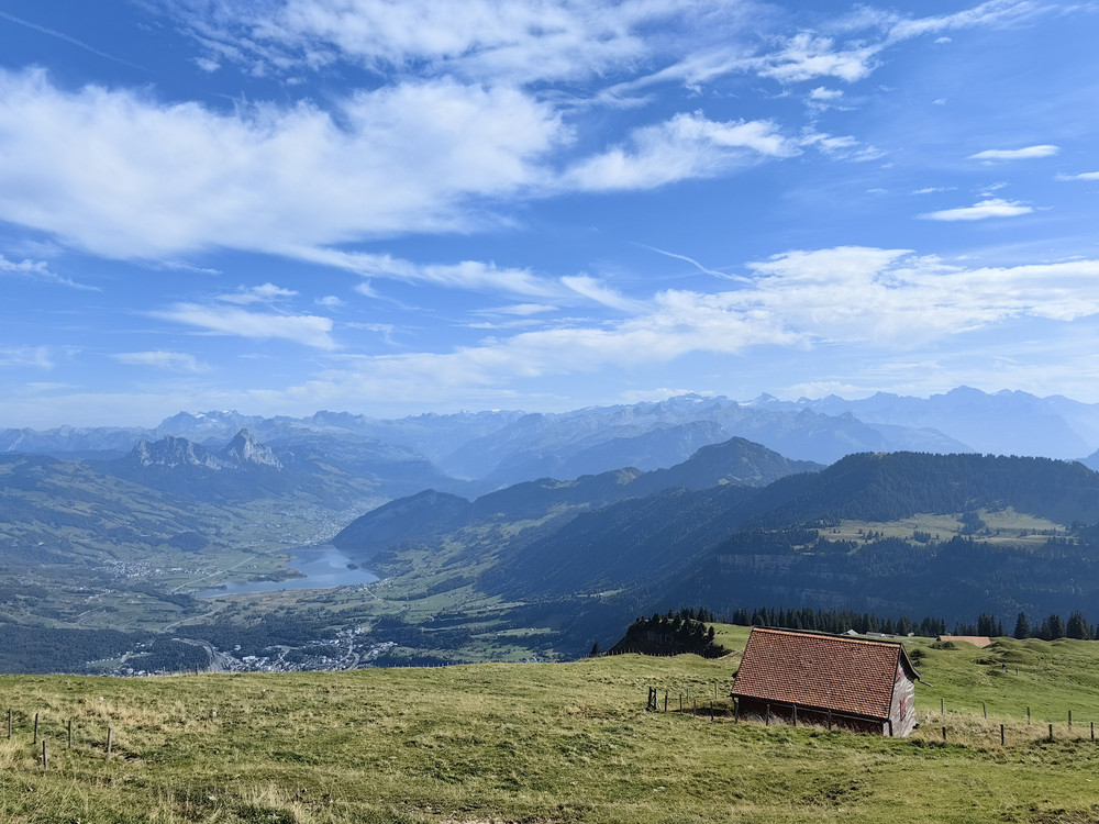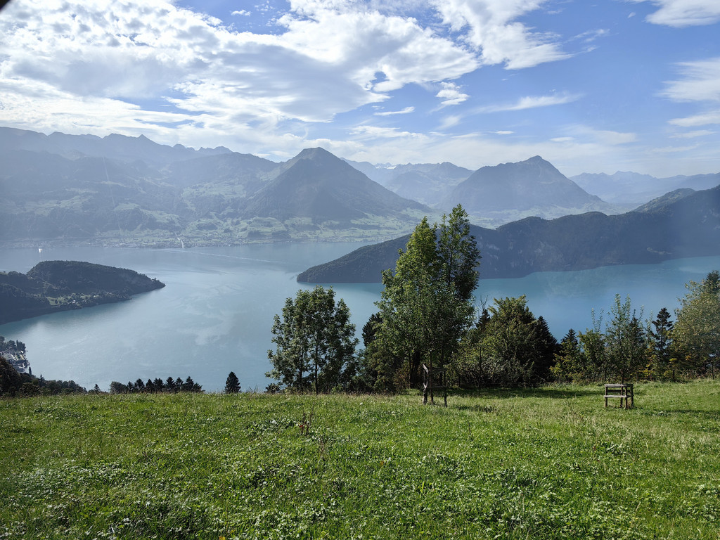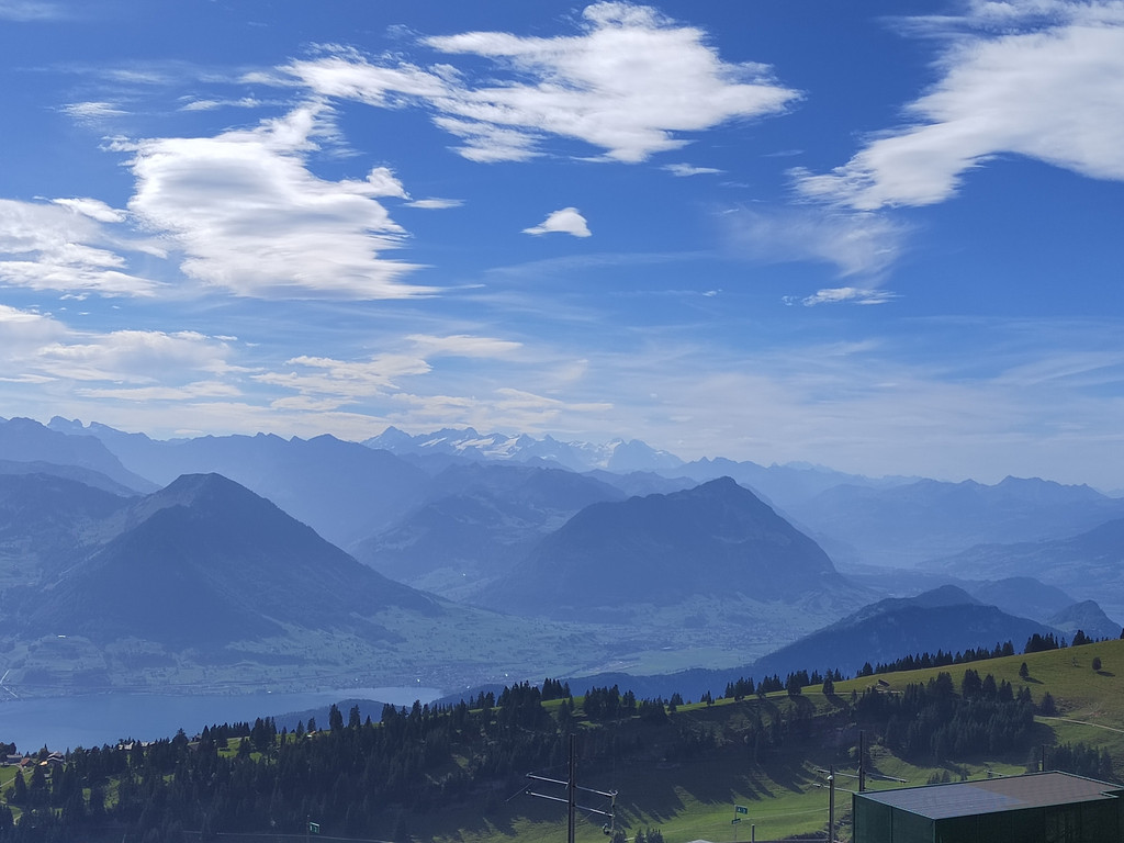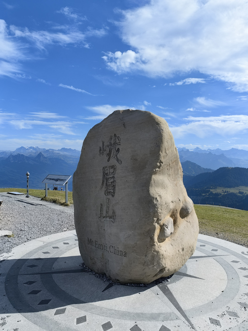 一到山顶立刻感受到寒风阵阵,赶紧添衣,极目远眺,崇山峻岭,可以看到远处白雪皑皑的阿尔卑斯山脉。说是山顶其实有很大一片地方,都是缓坡可以四处走走(就是风大)。得益于瑞吉山自十九世纪以来观光胜地的名气,这里的交通住宿餐饮各项旅游设施非常完善,老人孩子宠物都可以上来,另外它与四川的峨眉山还是姐妹山。
