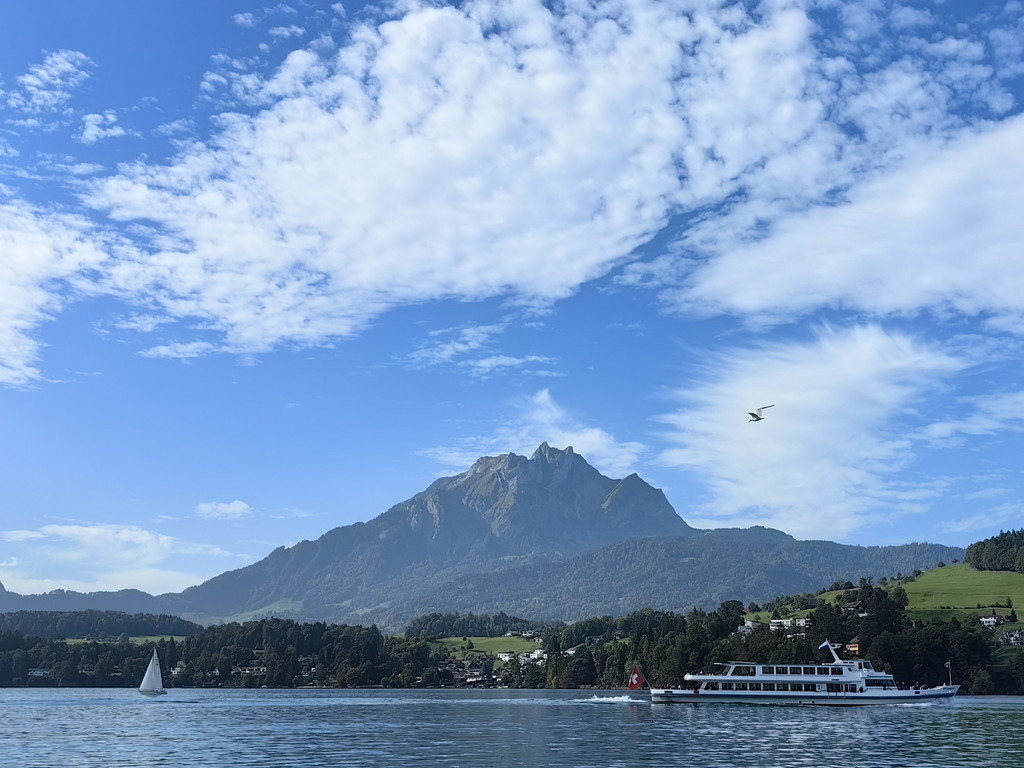 D11今天的目标:瑞吉山(位于阿尔卑斯山脉最前沿,1798米)。从卢塞恩火车站边的码头坐船一个小时,下船直接换乘小火车40分钟到达山顶,一路景色优美,湖光山色间恍惚有喀纳斯的影子。