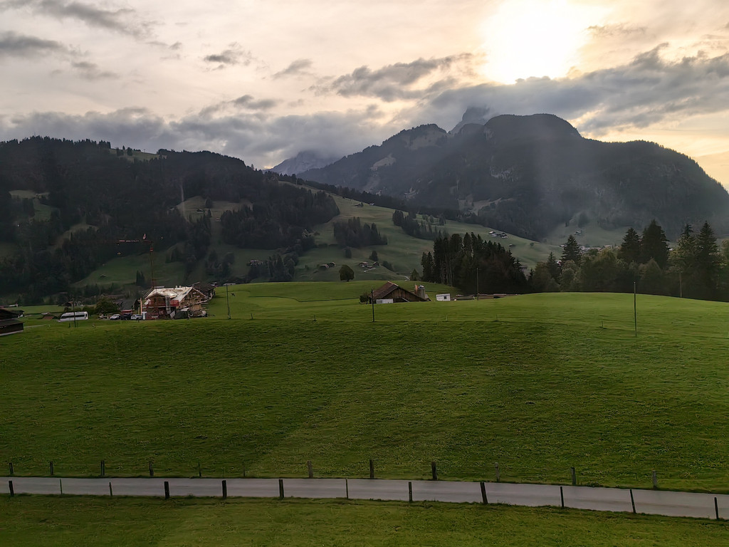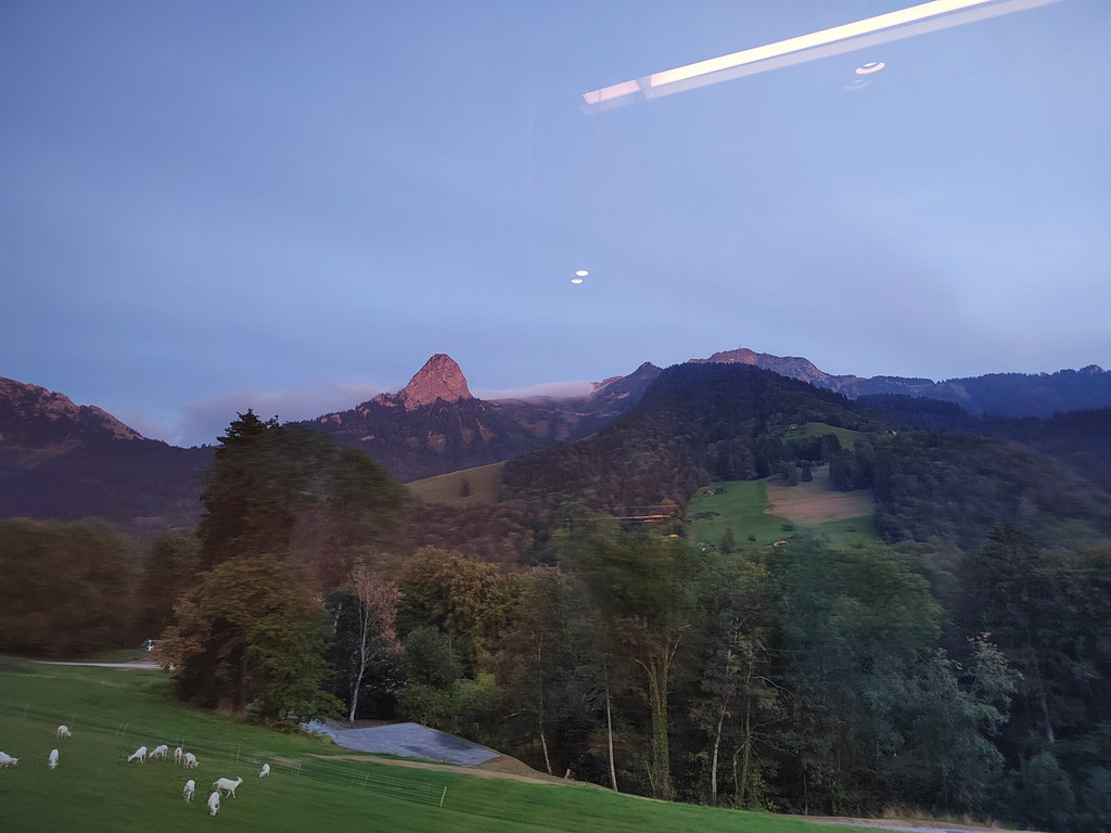 D12今天是属于“金色山口列车”的一天,卢塞恩—因特拉肯—蒙特勒(住宿):由于火车有一段在修,所以中间还接驳了一段汽车。火车上人不多,找到一节人少的车厢(只要座位上方屏幕没有标记就可以随便坐),静坐看景即可。绿草如茵、山峦叠嶂;湖边夕阳、美不胜收。