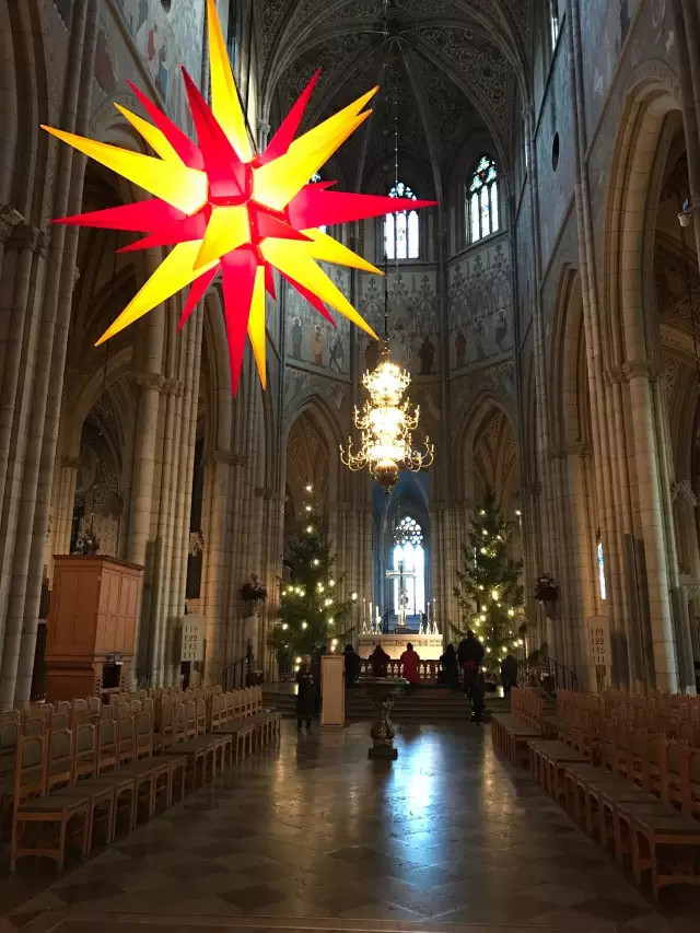 和J一起两人想去逛街(其实商场都没开),先做公交车,错过站没下,然后转地铁,看到地铁来了貌似方向对的就跳上去了。结果出来不知道是什么地方。全瑞典语看得晕晕乎乎的,随便走走吧。看到一大片草地,连接着一个城堡,是Hedvig Eleonora Kyrka 天主堂(当时连名字都不知道,刚在地图上找到的)。正好赶上了11点开始的礼拜(瑞典语礼拜),于是我们踏入教堂一同感受节日+主日的祷告和唱诵。教堂非常的大,楼上楼下座无虚席。父母带着孩子,老人牵着老伴,都是盛装出席,大红色的裙子,红色领带领结,红色的围巾,一派喜气洋洋。