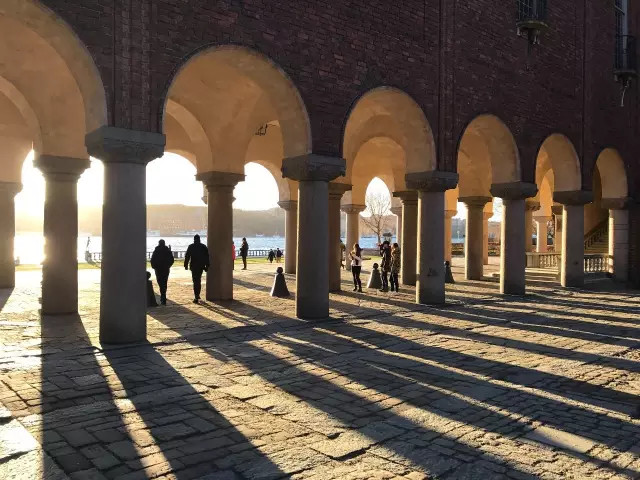 议会厅出来就是百拱厅,是斯德哥尔摩市政厅的荣誉入口处,国王和贵宾就是通过这里到达蓝厅的,相当于贵宾通道吧。屋顶有一百个蜂窝状的拱,代表100名议员,后来发现偶数名议员会出现票数相等的情况,就增加了一位议员,现在是101名。本届议会一共有50名女性议员,51名男性议员,可见在这个国度男女还是很平等的。大部分议员是兼职的,因此议会的会议通常在下午4点以后才召开。