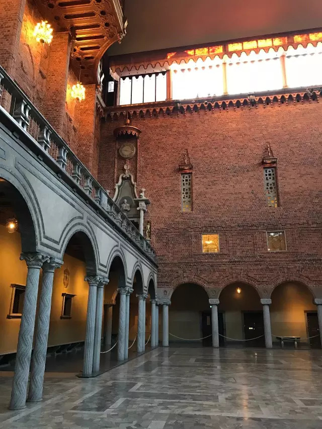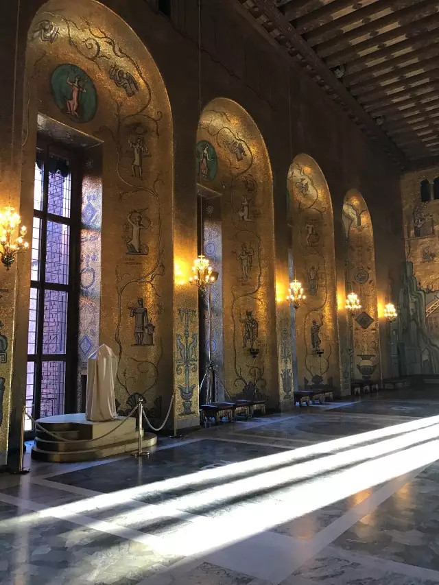 市政厅必须在解说员带领下才能入内参观。一楼的蓝厅,也是每年诺贝尔奖颁奖结束后举行晚宴的地方。解说员说这个大厅还能租来结婚用,气派!