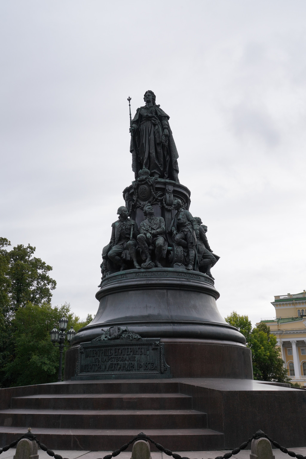 【叶卡捷琳娜铜像】为了来俄罗斯旅行,我再次拜读了《叶卡捷琳娜二世》这一部小说,在俄国的历史上,只有两位皇帝被称为大帝,一位是杰出的沙皇彼得一世,另一位就是叶卡捷琳娜二世。她在位长达三十四年,在位期间,对内加强贵族专政,对外侵略扩张,她传奇的一生,使俄国在当时日益强大,更有欧洲宪兵之称。有传说,铜像下一层的男士,与这一位传奇大帝有着千絲万缕的关系。