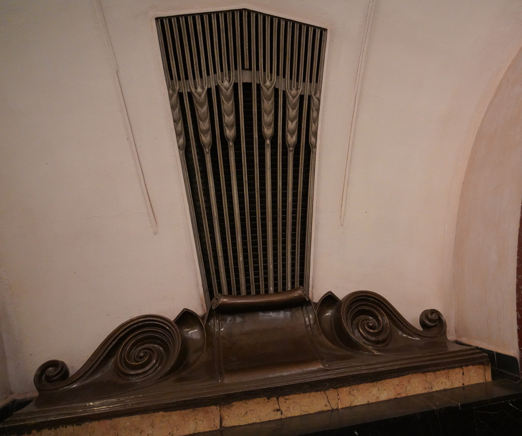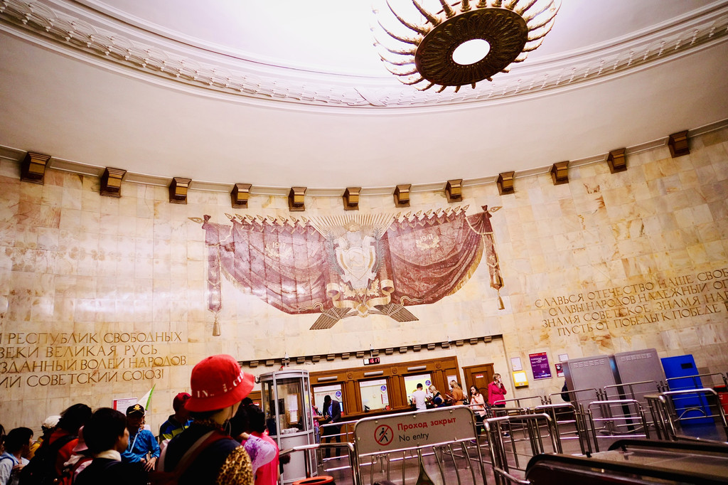 从红场出来,拐弯就到了莫斯科的红墙广场地铁站,莫斯科的地下铁,值得好好看看,它是五十年代建成的,至今评价还是世界第一,广场站、基辅站……给人留下深刻的印象,突出了俄罗斯建筑的前瞻性,艺术性,把地铁站建成一座艺术博物馆, 照片上的这个站,虽然没有共青团站那么豪华,但已经让我不能忘怀。这些雕像都以普通的劳动者为主调,工、农、兵、学商,的雕塑,体现当时苏联人民当家作主的主旋律。