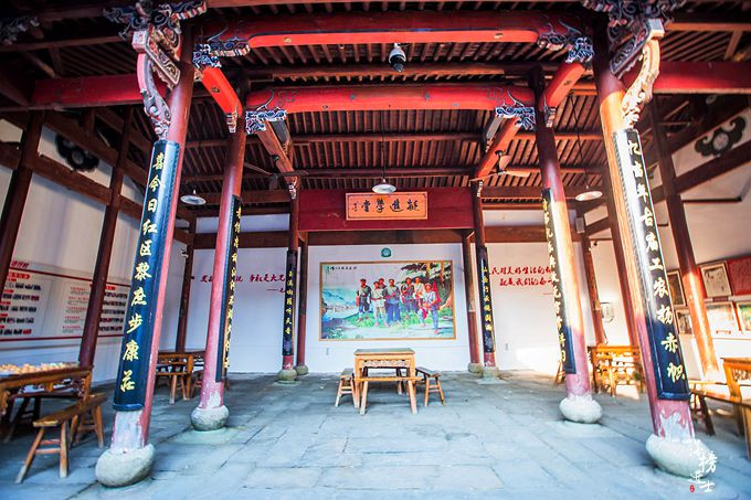 古旧的庙宇中,贴着反映当时工农红军的油画,柱子上是掷地有声的各种宣传语,在这样的环境中,很容易就让人产生一种身处革命年代的代入感。
