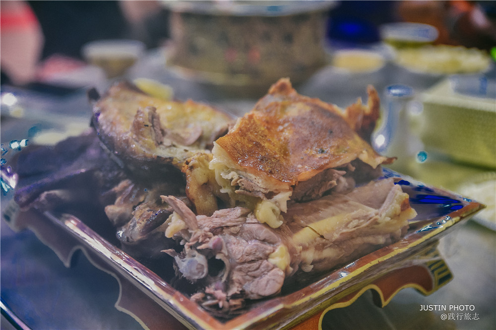 蒙古大营的烤全羊真的太美味了,烤全羊用车子推上来,于是持刀的“王爷”向我们展示了开吃的仪式,首先割下几块肉敬神灵,然后开始把烤全羊分割成不同的部位供我们食用。