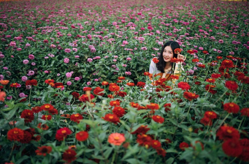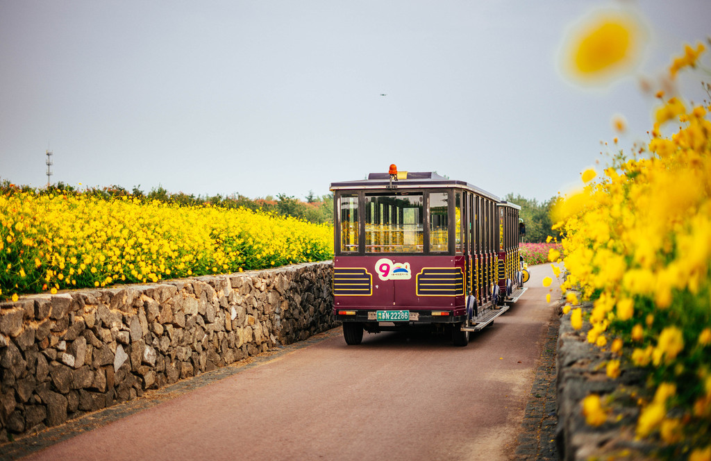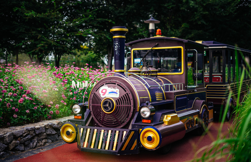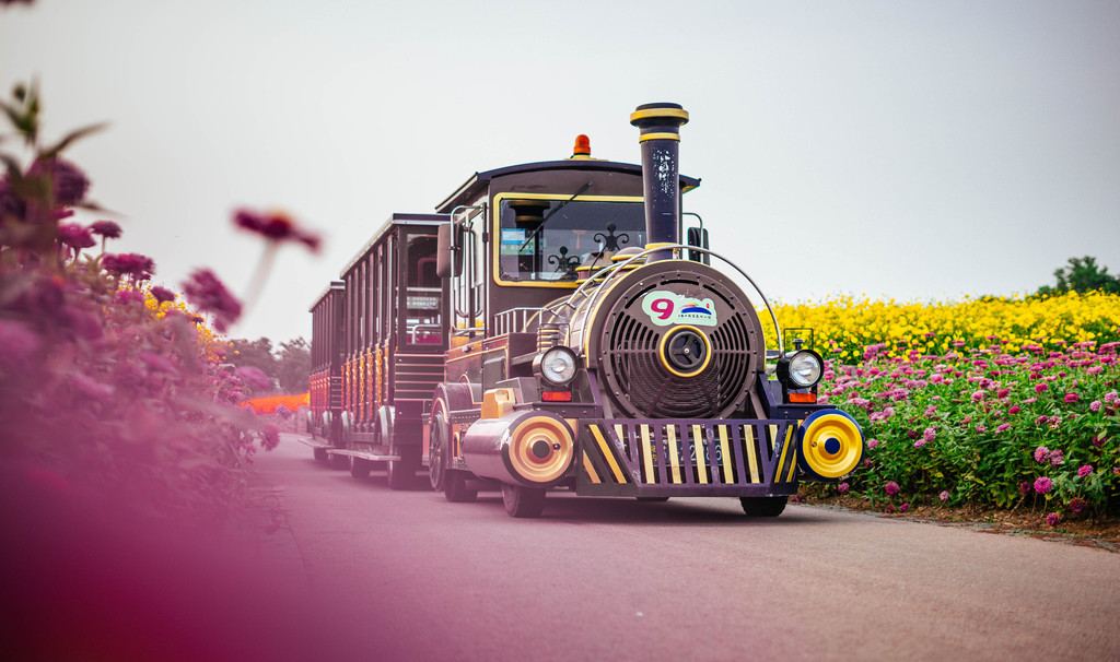 复古的小火车从花团锦簇的花间小道驶过,留下叮叮当当的回声,为这唯美的秋景配上了背景音乐,乘上小火车,左右两边的不同花色快速闪过,风也凉了起来,可是……管他呢!