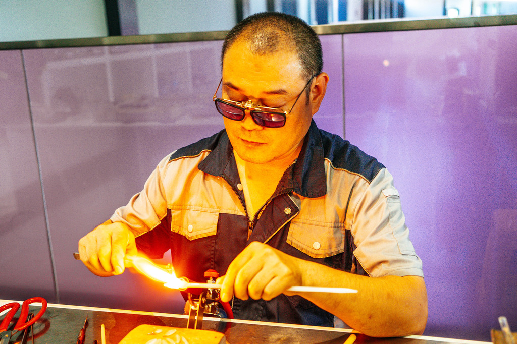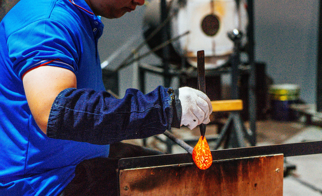 吹制玻璃,是一种技术,目的是为了让玻璃成型。为了不让熔得早已软化的前端掉落,吹玻璃的老师傅必须一面吹,一面又不停更转手中的玻璃棒,对于我这种第一次接触玻璃世界的人来说,眼前的景象特别新鲜有趣。