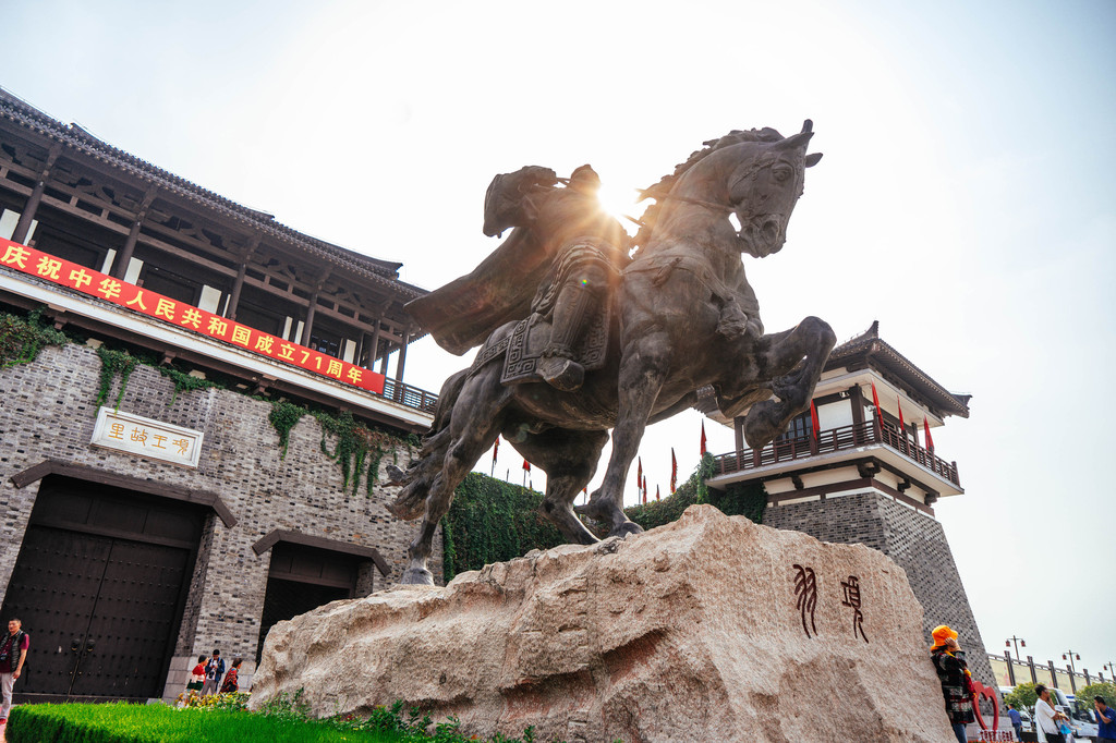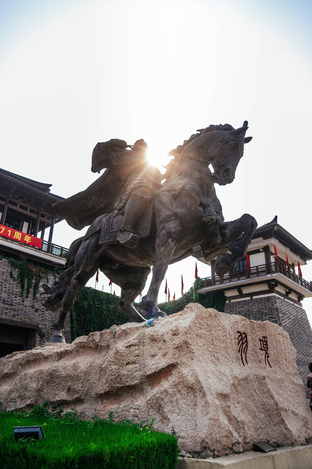 到达景区门口,立刻被门前这尊塑像吸引。项羽坐于马上,身形保持战斗的姿势。身下的乌骓马通体黑亮,如同黑缎子一般,唯有四只马蹄雪白。“踏云乌骓”的比喻甚是形象。明明只是一尊塑像,这一人一马的一身煞气扑面而来,让人没来由的备受压迫。