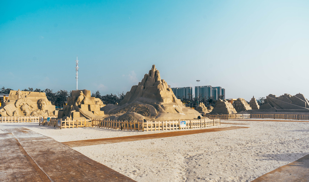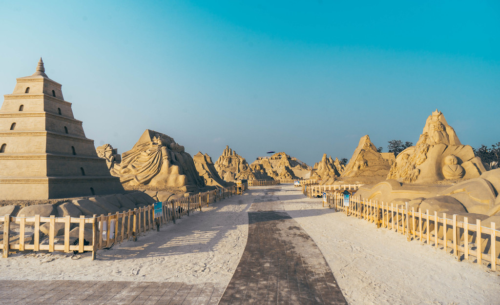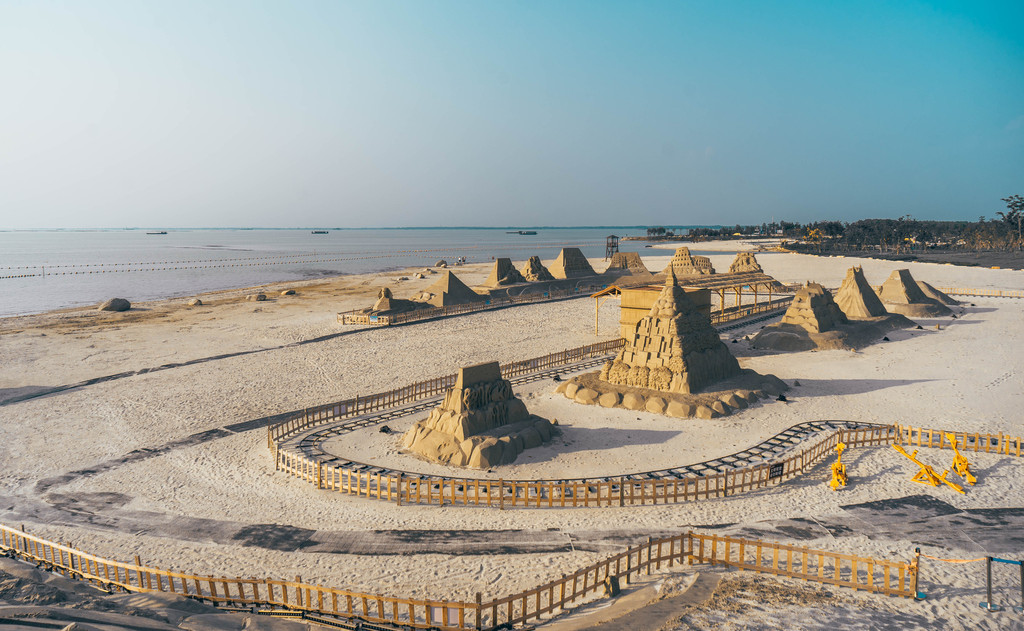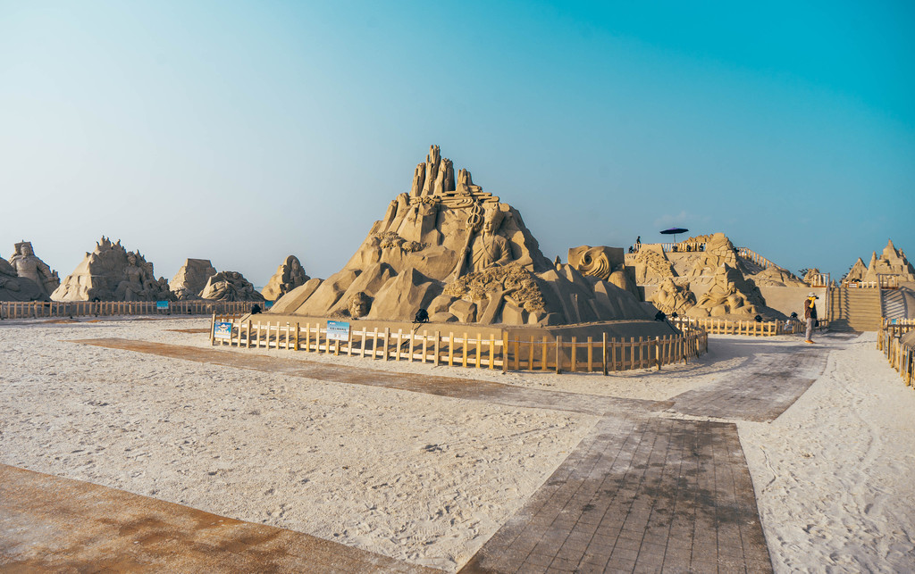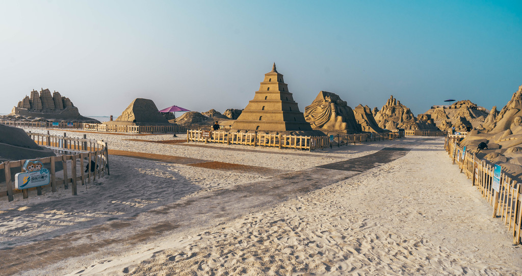 爬上瞭望台,竟收获了航拍视角,一座座沙雕盘在那漫无边际的水边,宁静且壮观。
