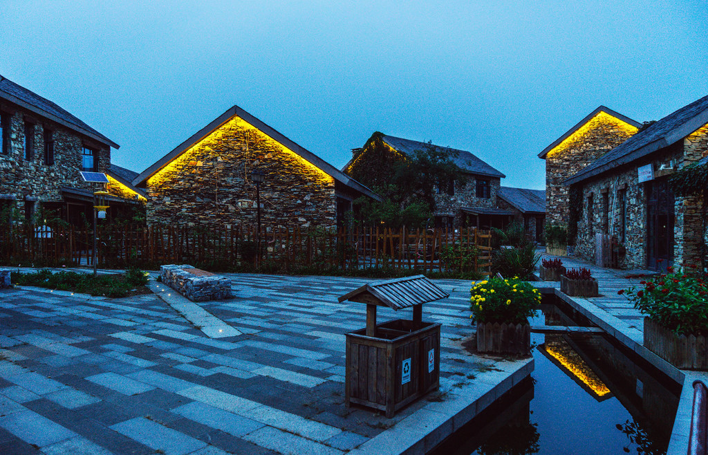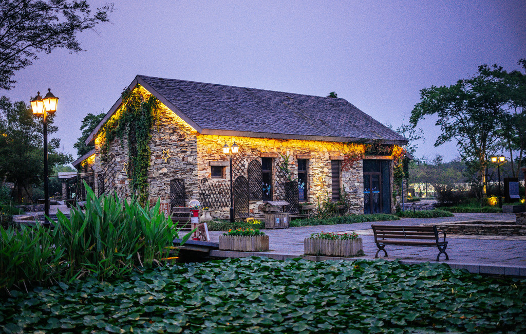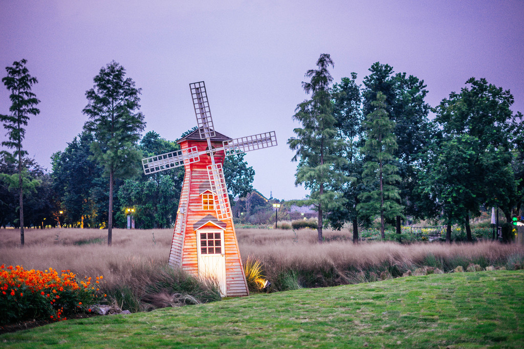 待到夜幕低垂,公园一角的衲田村也点起了灯,映照的周围一片灯光朦胧,煞是好看。粉黛乱子草中的风车摇曳,灯影在池中婆娑,乡村风情的民宿群也温婉可爱起来。