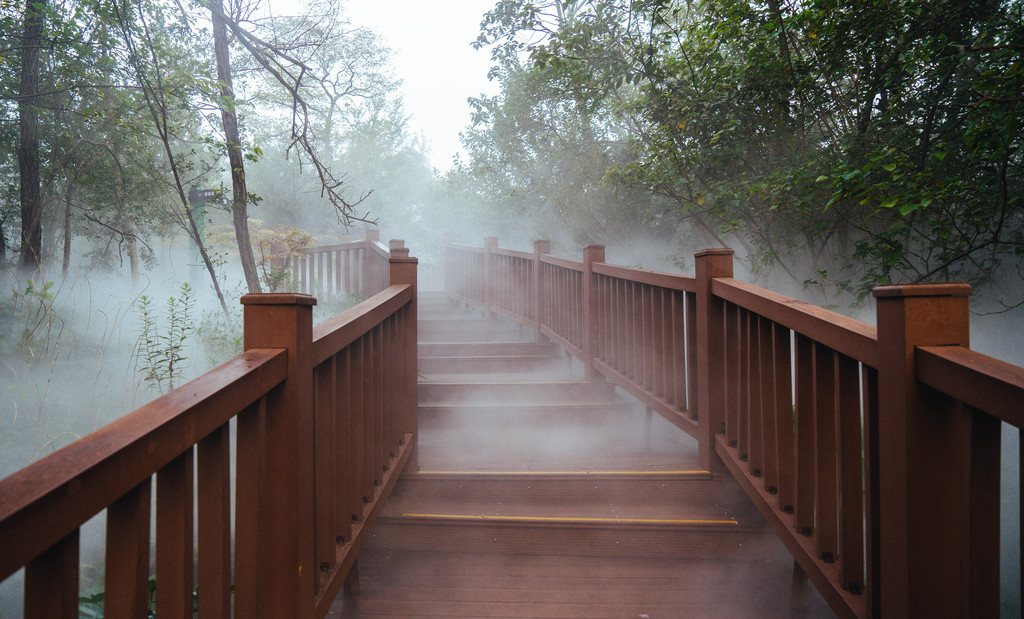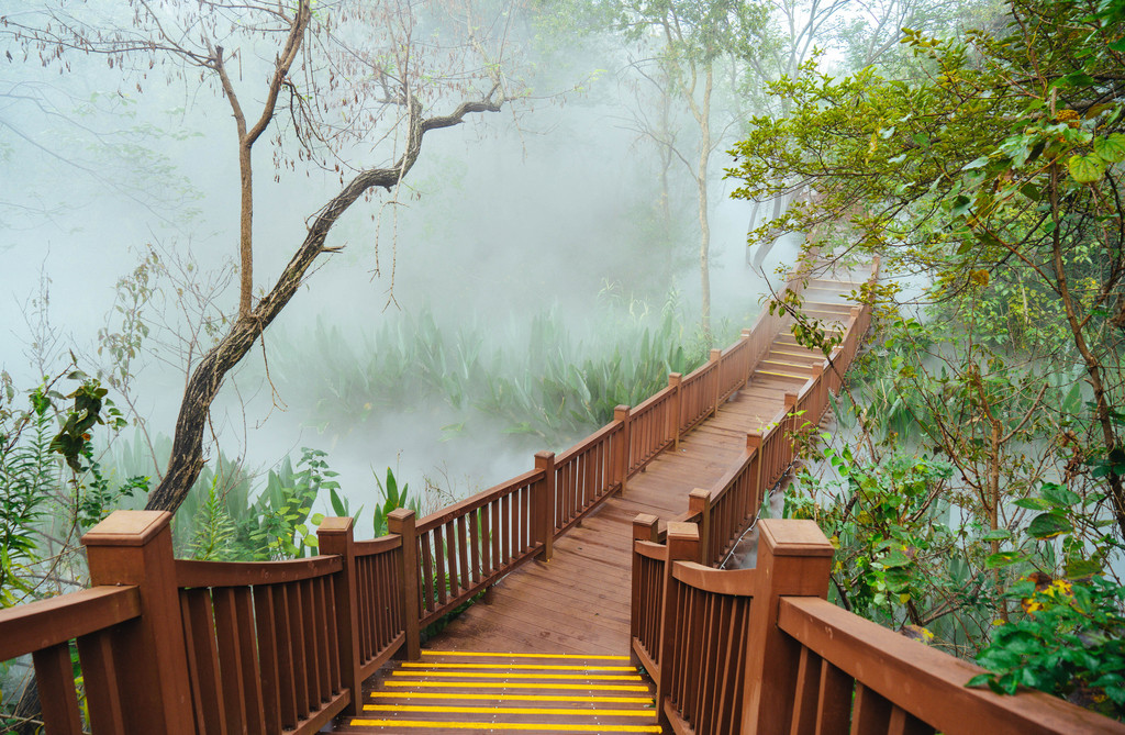 树也好,花也好,栈道也好,统统都被雾气裹挟,塞进大大的肚子里。