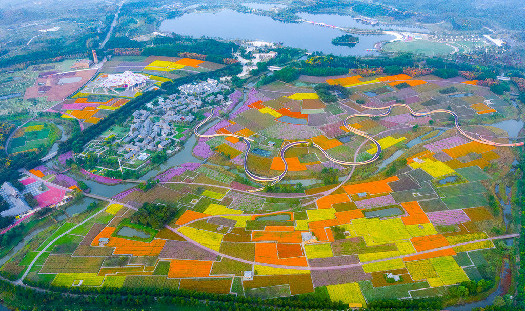 若是从高空俯瞰,沿着河流的大块大块花田,有点像补丁。