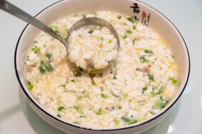 这里想推荐给大家的是蒲菜炖狮子头和平桥豆腐。虽然很多地方都吃狮子头,淮安蒲菜却是当地特产,全国农产品地理标志。尤以古城淮安(今淮安区)西南隅天妃宫所产为肥美,菜体洁白如玉,食之肥嫩清香,素有“天下第一笋”的美誉。