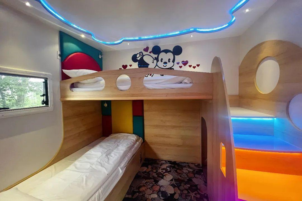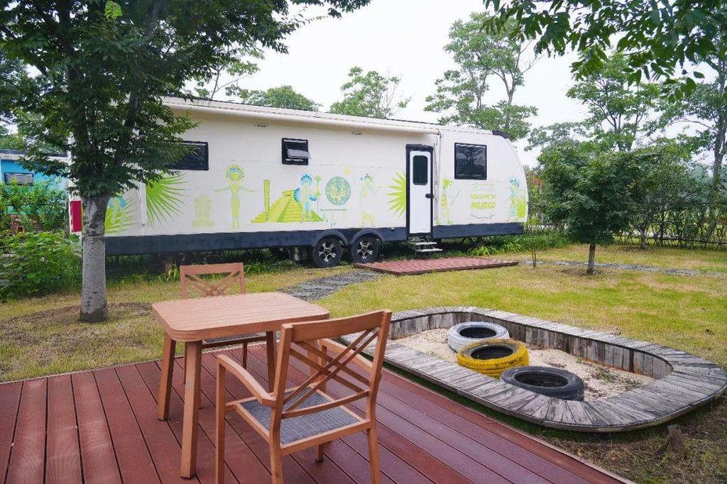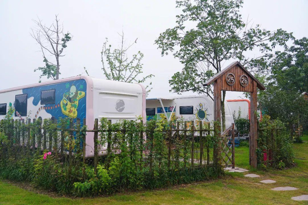房车基地的各个房车,不同的卡通造型,更适合亲子度假。