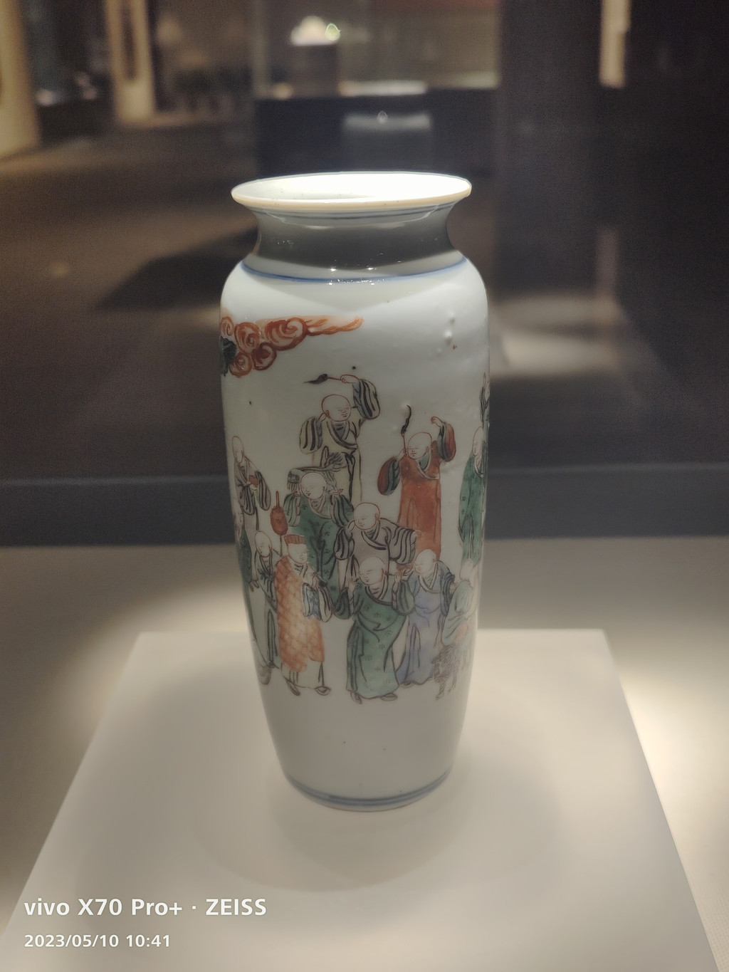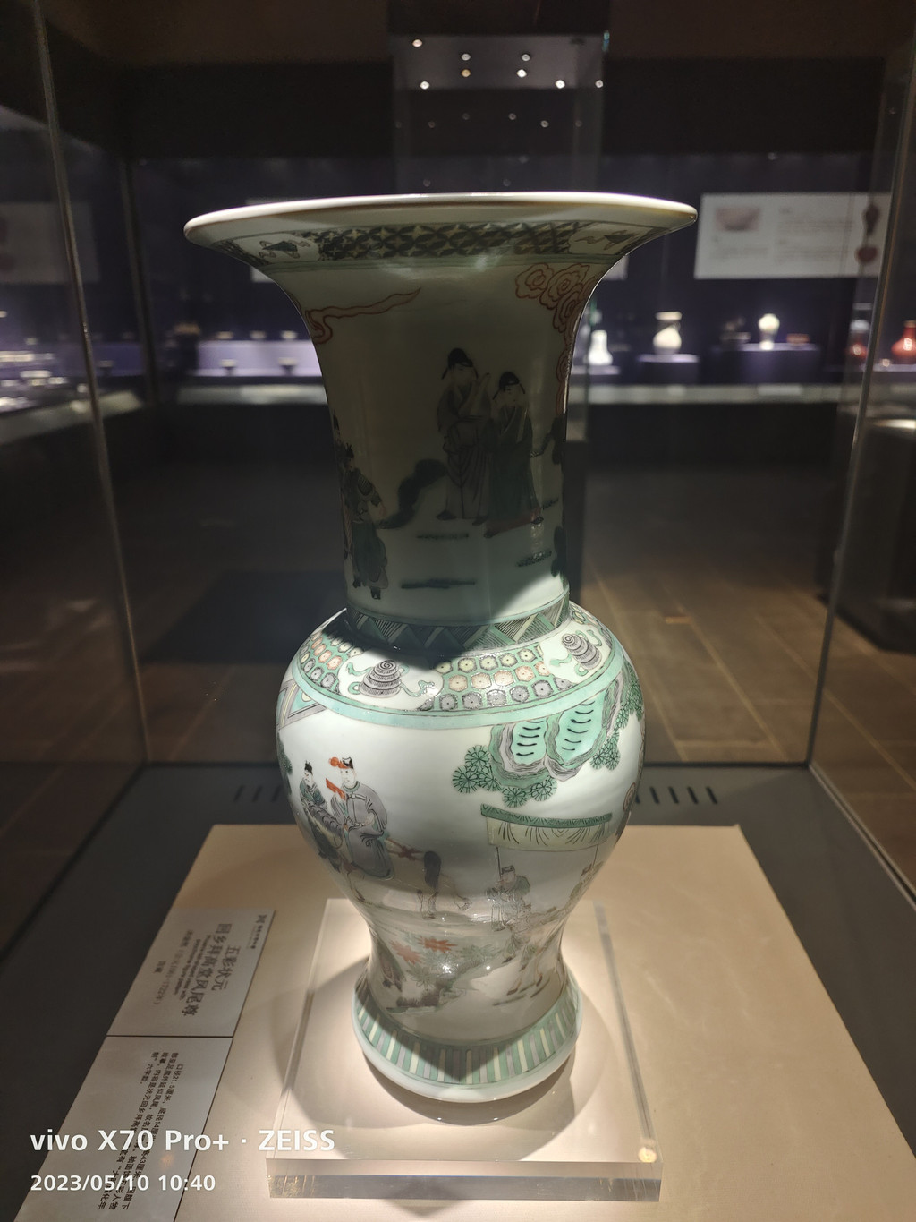 清五彩状元回乡拜高堂凤尾尊清五彩状元回乡拜高堂凤尾尊高43.5厘米,口径21.4厘米,底径13.2厘米,腹径20.4厘米。撇口,颈部挺拔,腹部圆鼓,平底外撇,因腹下部至足底外延似风尾,故名凤尾尊。此尊器形较大,线条优美,绘五彩人物故事,内容为状元回乡拜高堂,具典型康熙朝特征。